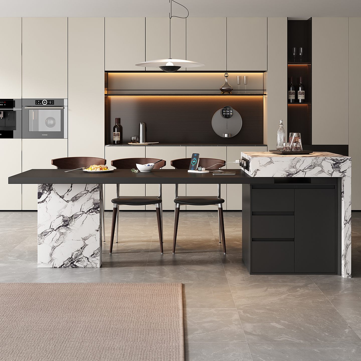 岛台餐桌一体可伸缩黑色岩板亚克力悬浮大户型开放功能储物中导台