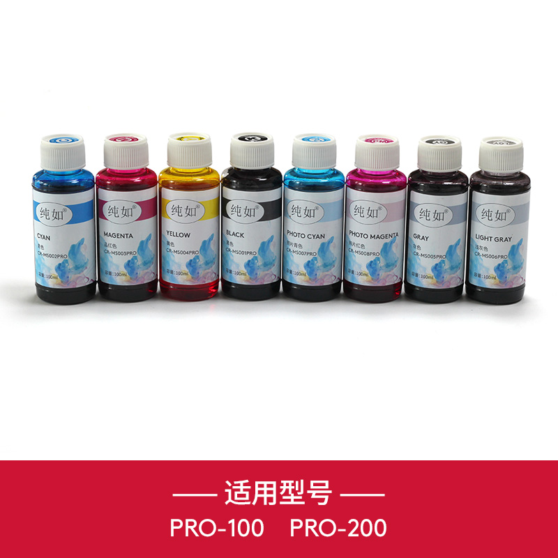 纯如填充墨水适用佳能PRO-200/PRO-100打印机墨盒照片青色品红色黄色照片青照片红灰色浅灰色黑色彩色8色染料