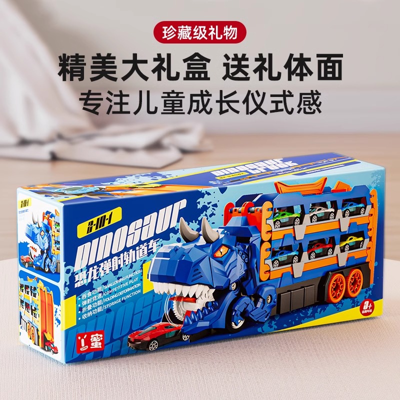儿童恐龙变形滑行弹射合金收纳小汽车男孩3霸王龙吞食轨道玩具车