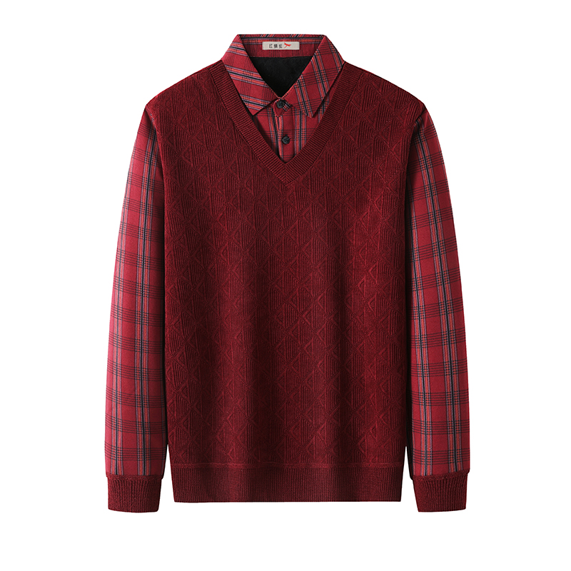 红蜻蜓男士假两件毛衣加绒加厚冬季新款休闲保暖爸爸装针织打底衫