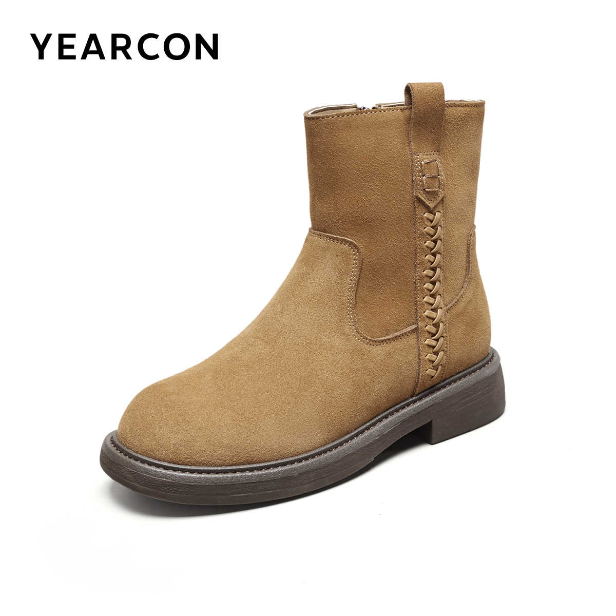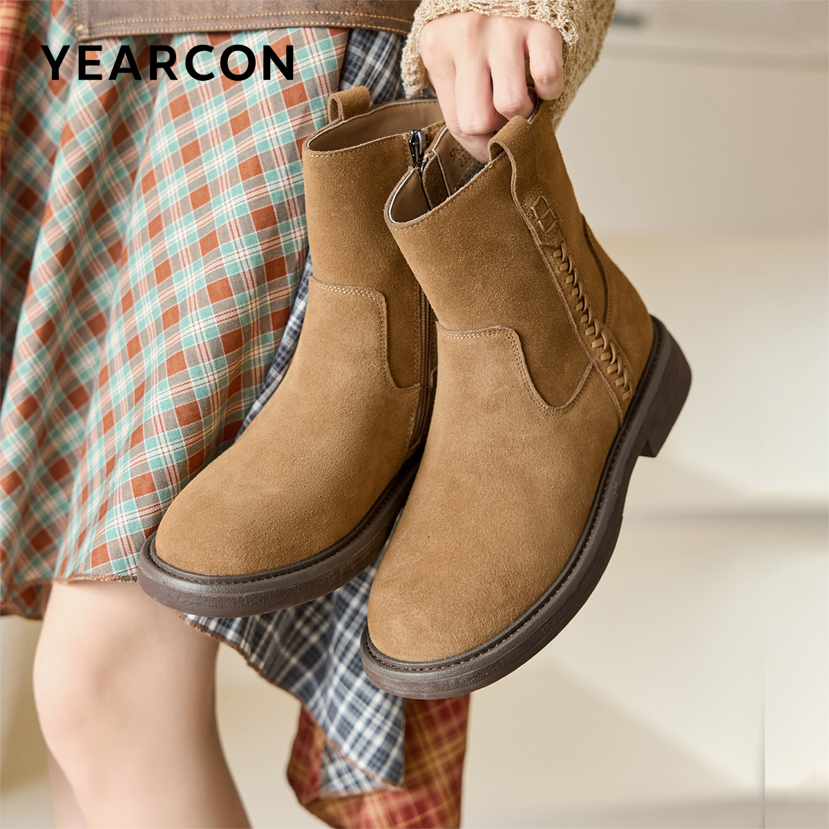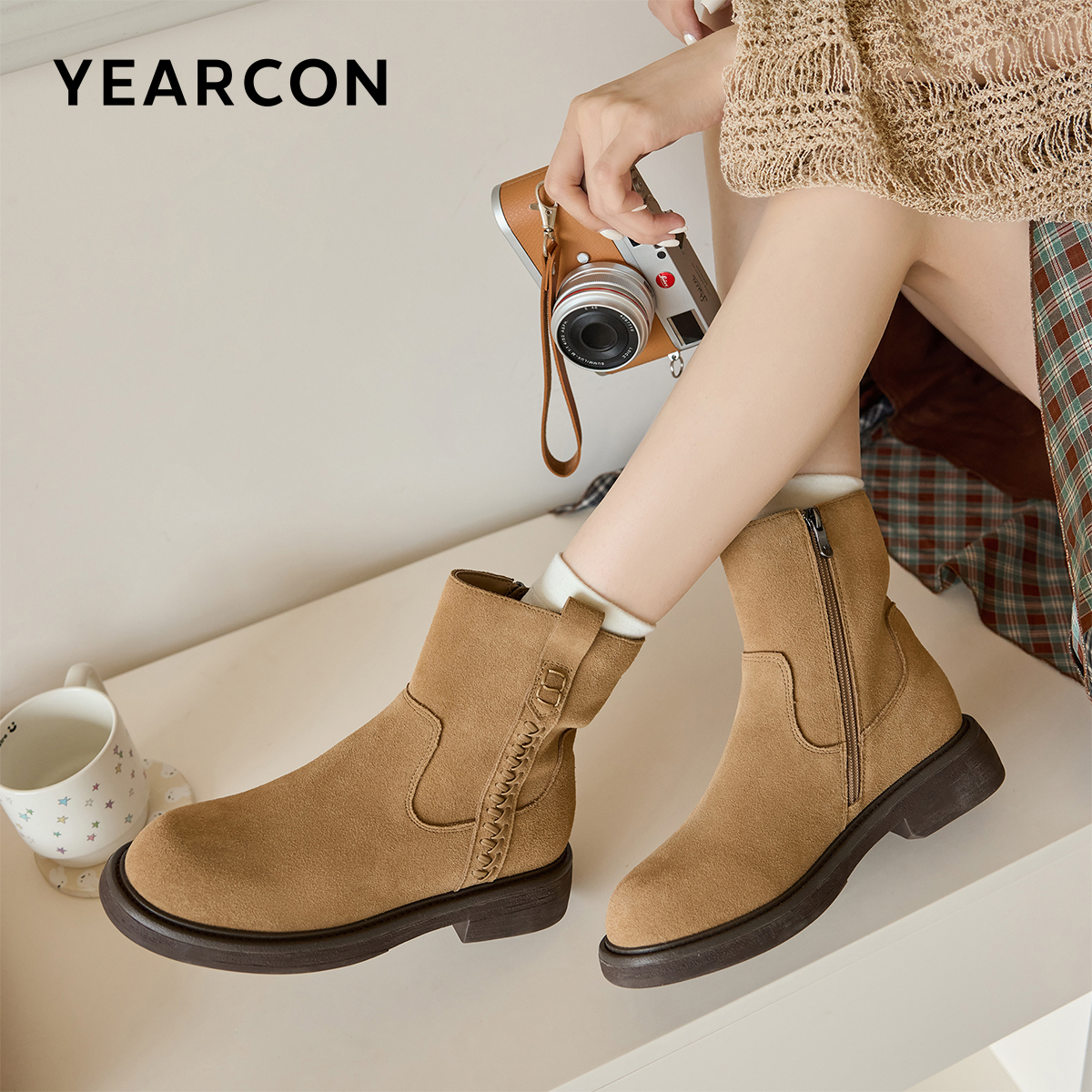 意尔康女鞋2025冬季休闲加绒短靴粗跟气质显瘦复古及踝靴女士磨砂