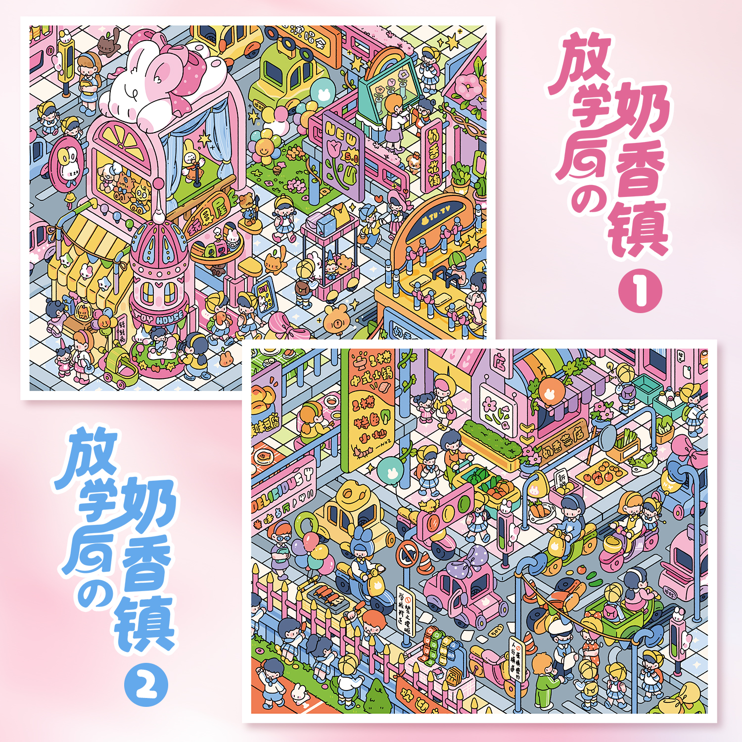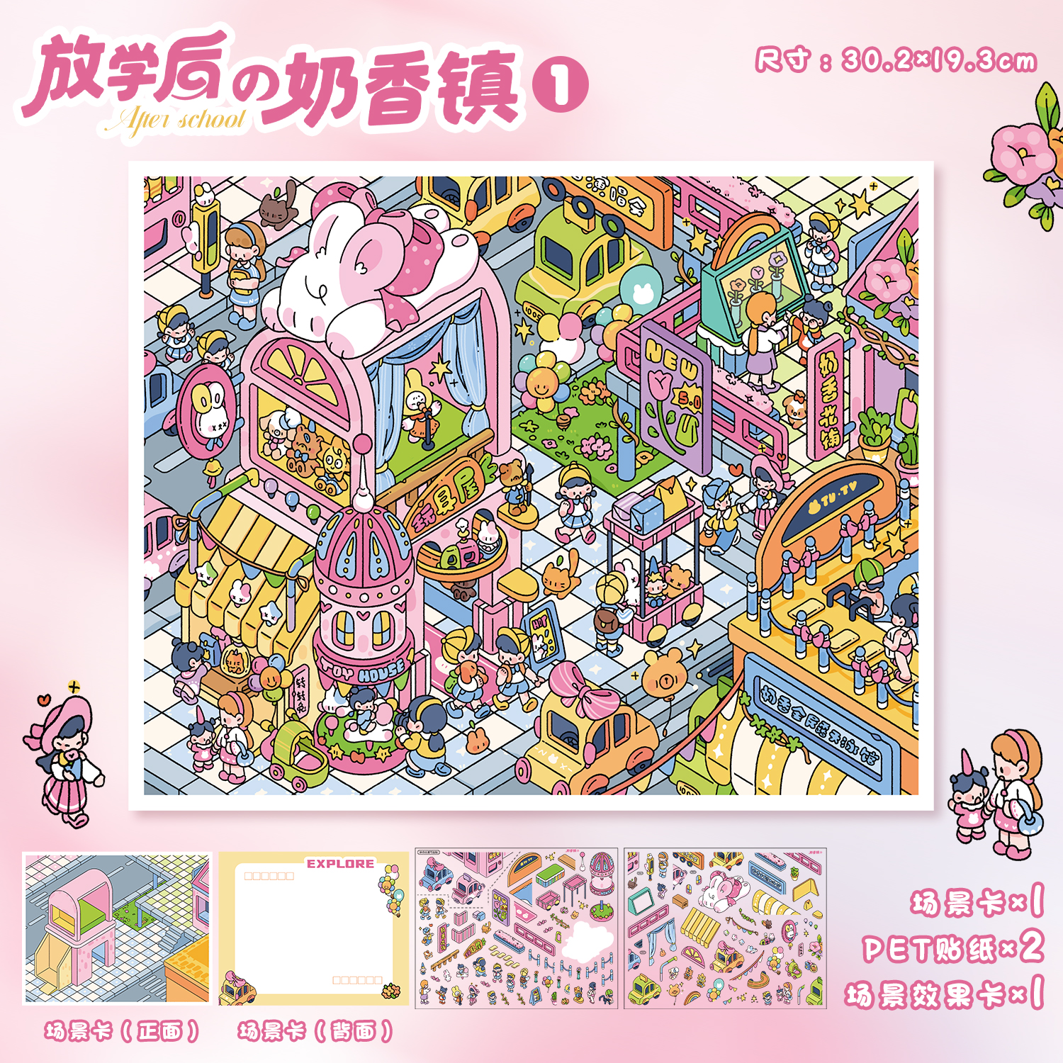 【折叠版】放学后的奶香镇造景贴纸超大版艺蓝96.0微缩场景合集本大号3d立体小屋贴画手账帐diy拼图玩具女孩