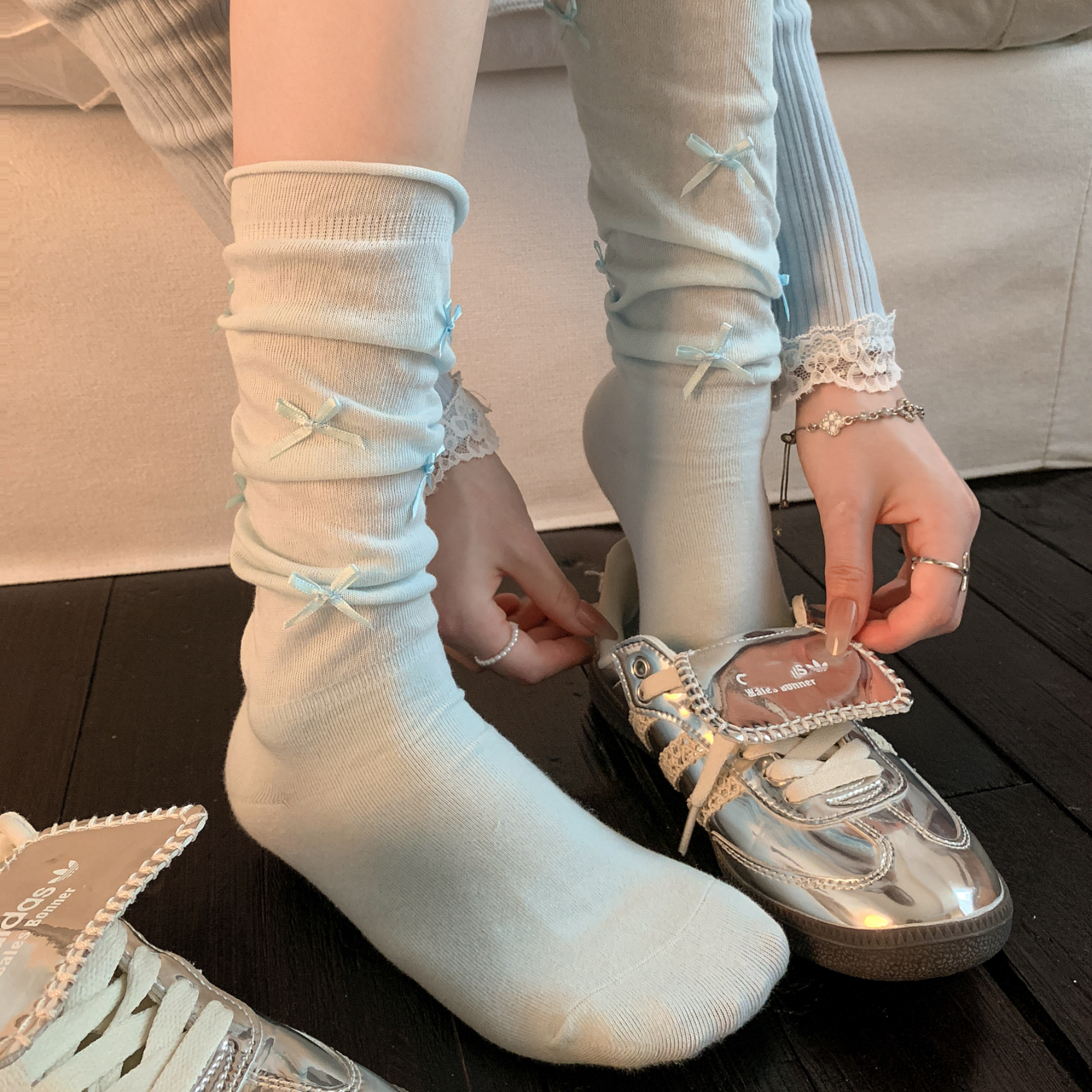 miu灰色卷边蝴蝶结袜子女中筒袜夏薄款堆堆袜纯棉透气长袜芭蕾风