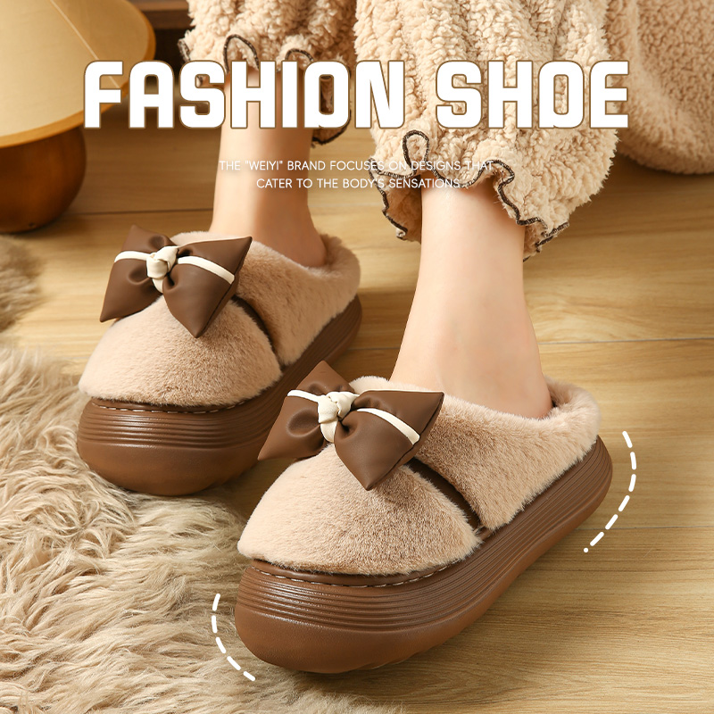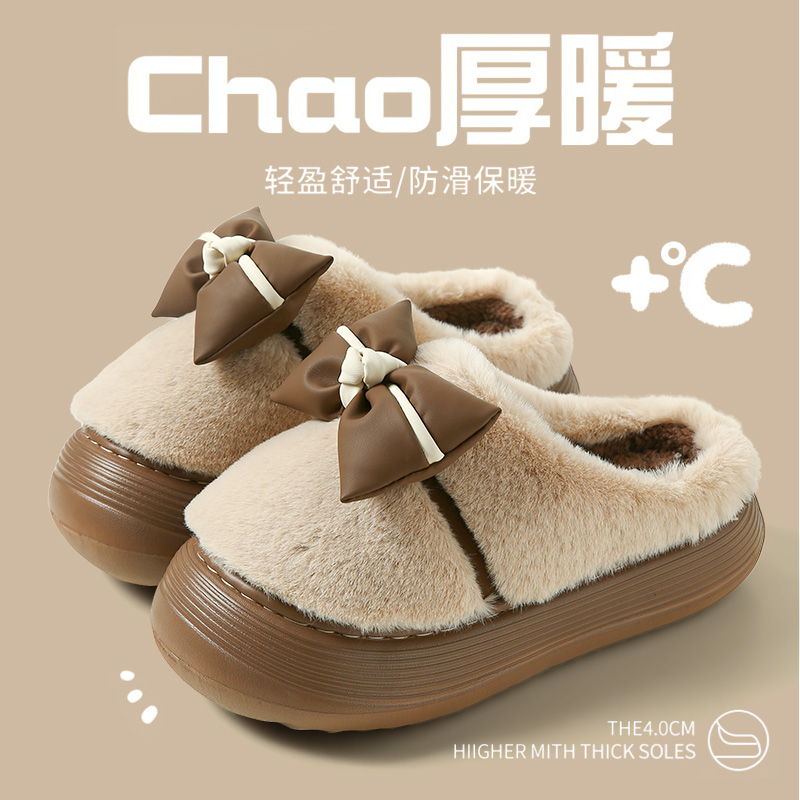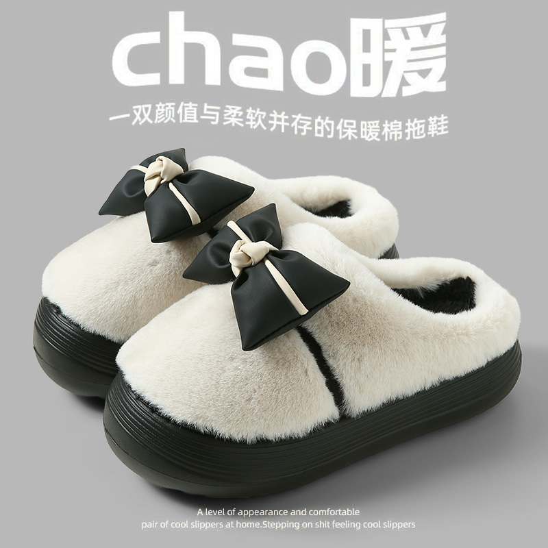 蝴蝶结毛绒保暖居家室内厚底月子棉拖鞋女士多规格