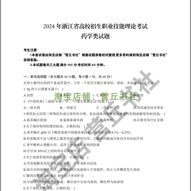 2017-2024年浙江单考单招职业技能理论考试药学类历年真题课业本