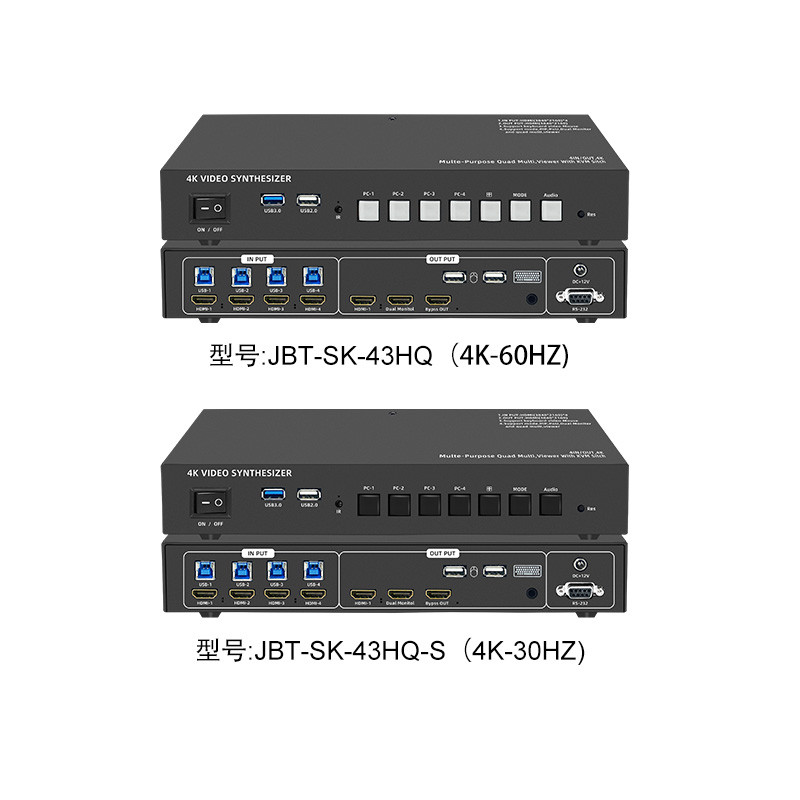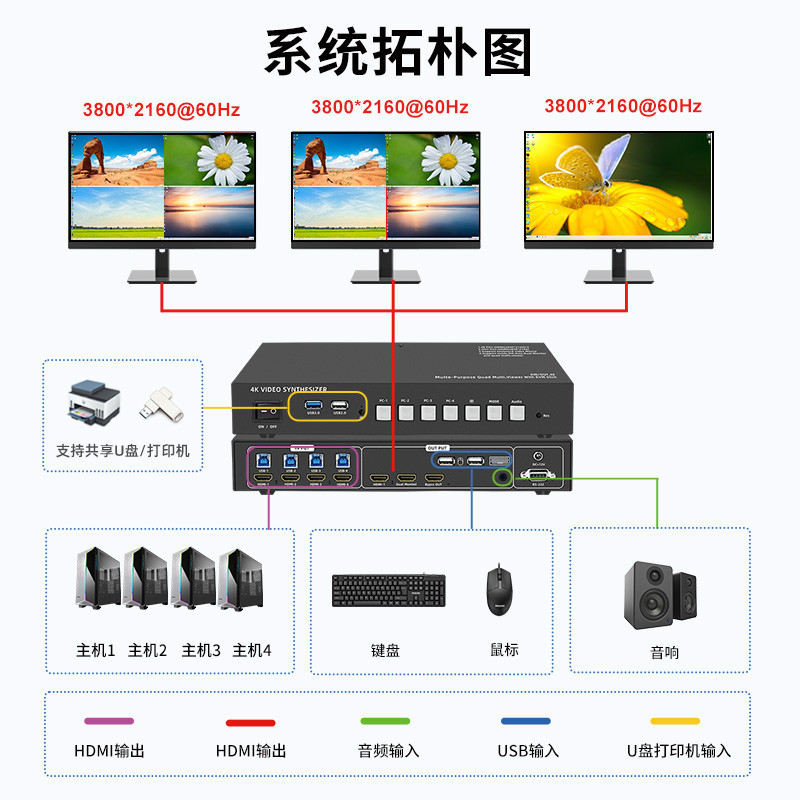 4K画面分割器4进1出KVM画面大小任意调节共享U盘打印机电脑分屏器
