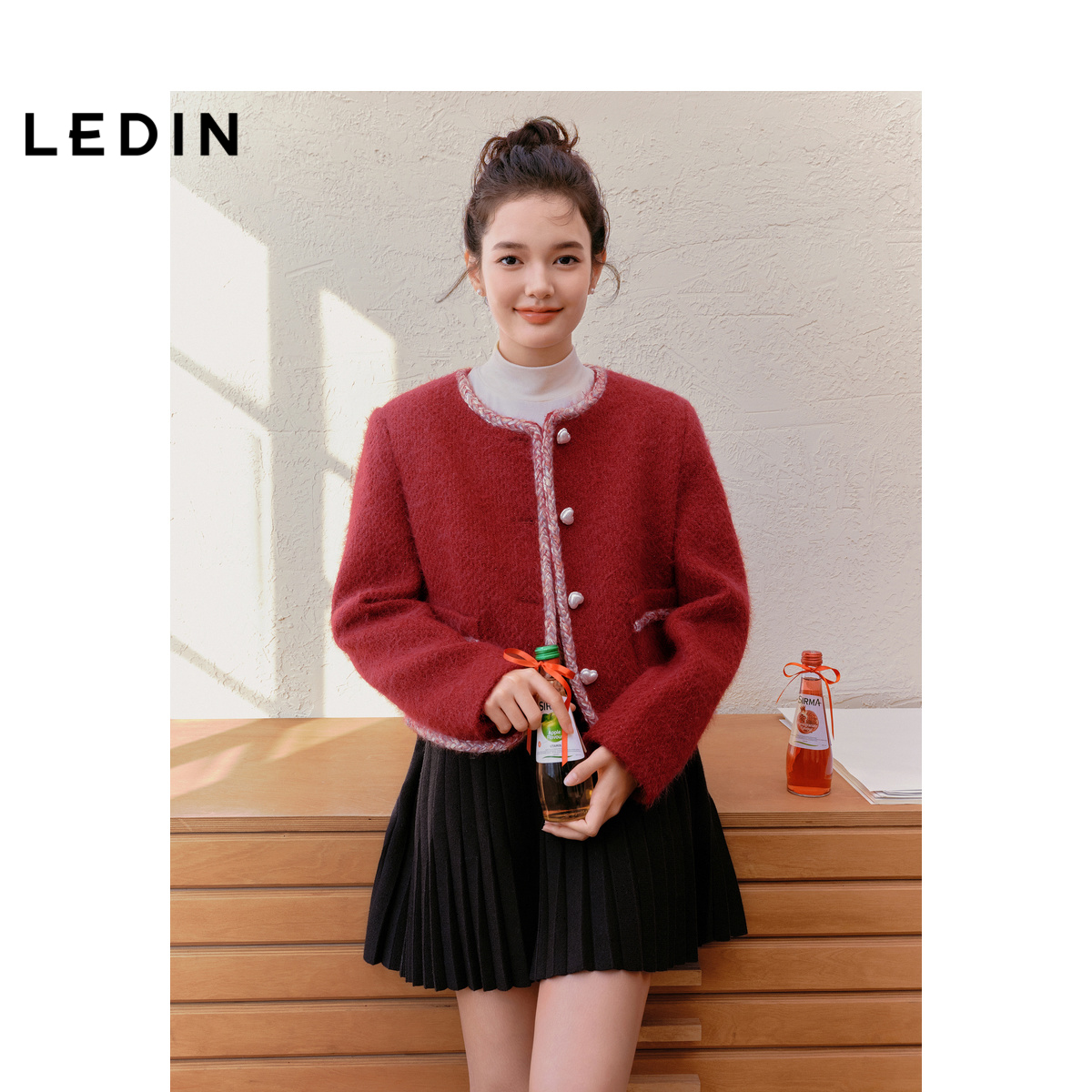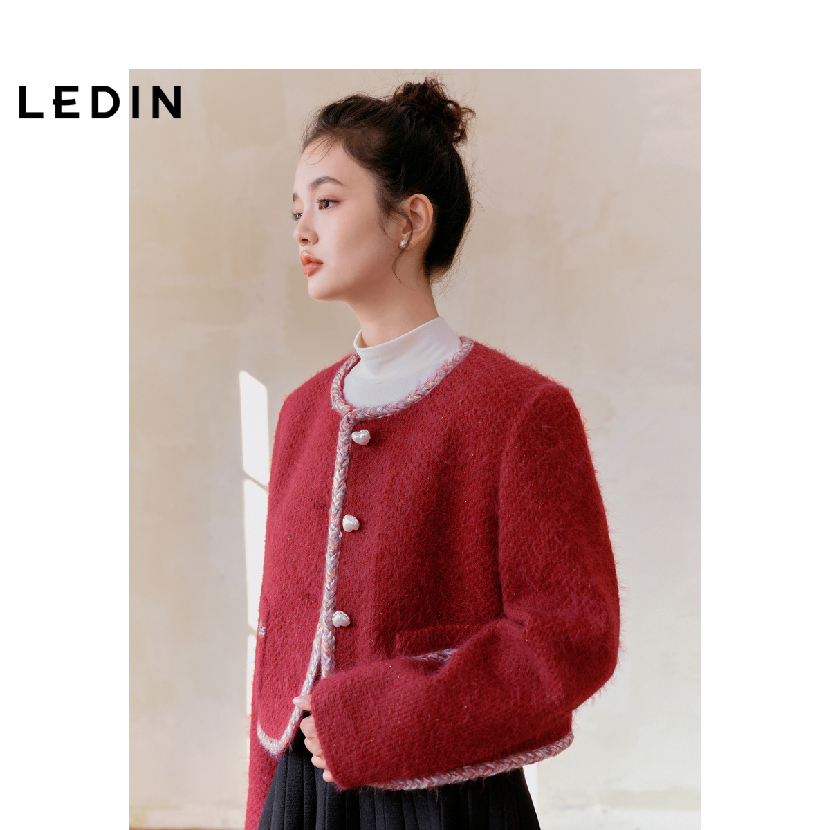 乐町富家千金红色小香风毛呢外套女2024冬季新款爱心珠扣新年战袍