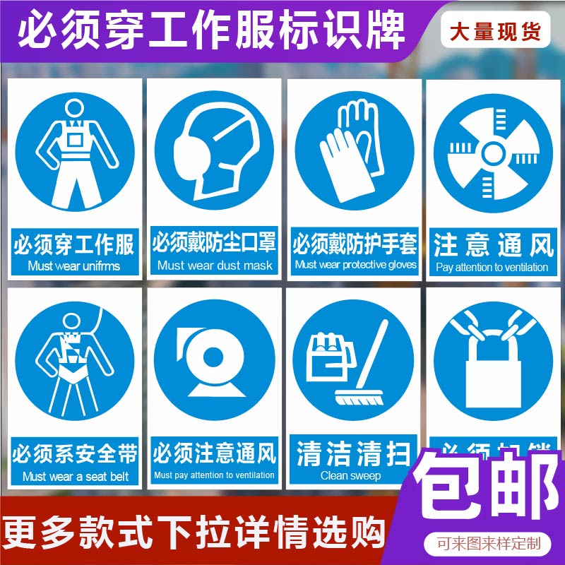 必须穿工作服注意通风注意防尘标识牌标牌警示牌指示牌蓝色指令防护安全提示牌标示牌警示标志警示贴