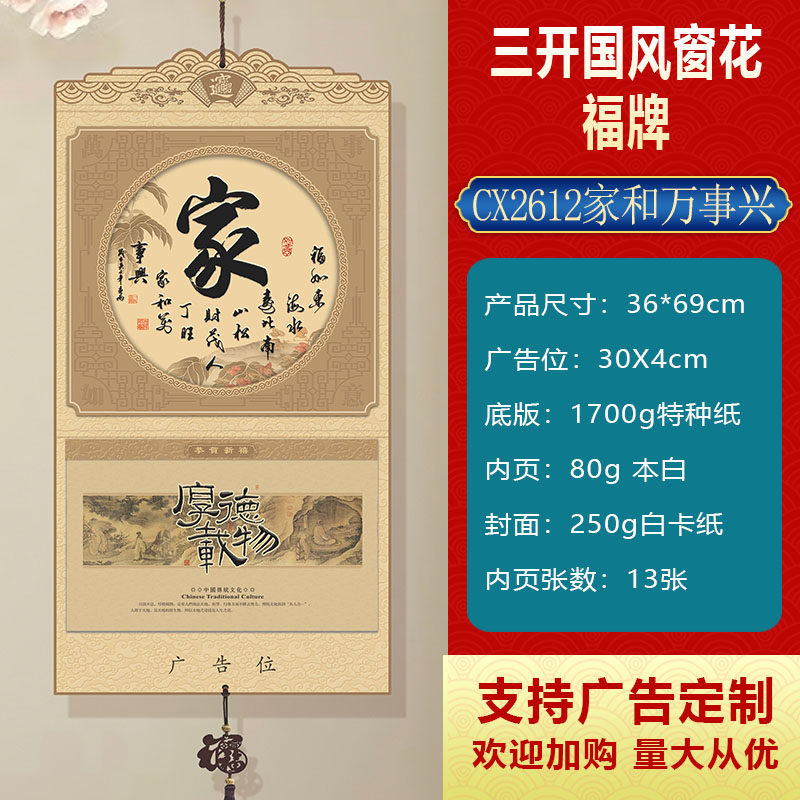 2025马年月历一月一张高档挂画米黄三开立体窗花福字吊牌挂历定制
