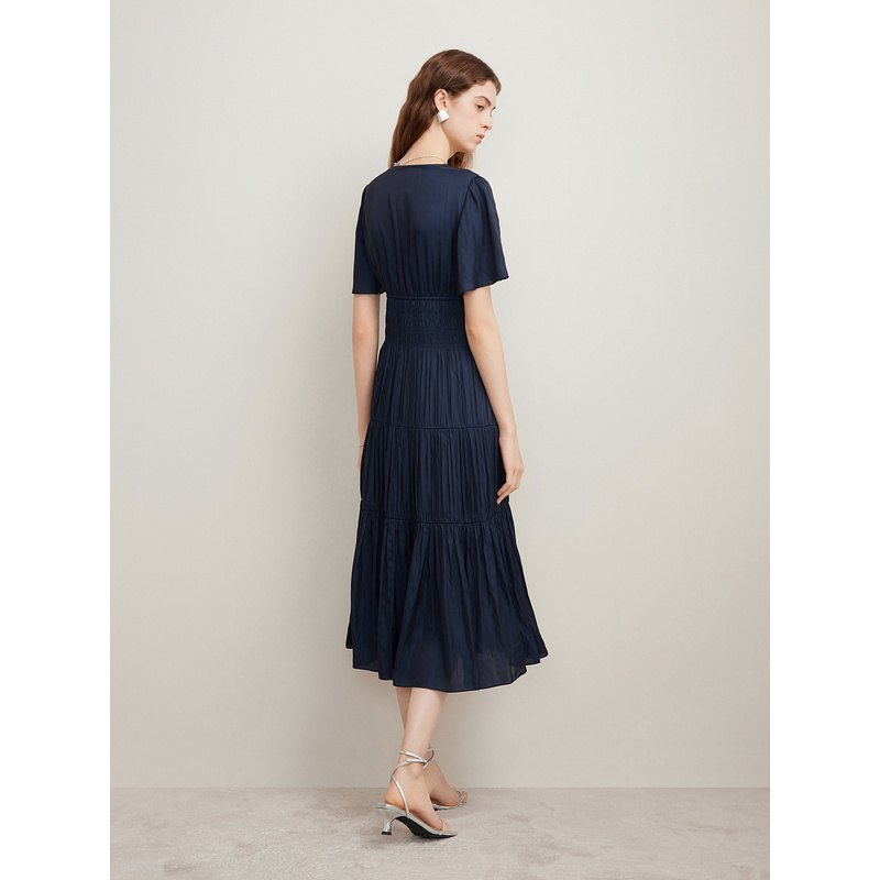 Goodland美地夏季法式优雅度假风开衩收褶收腰连衣裙