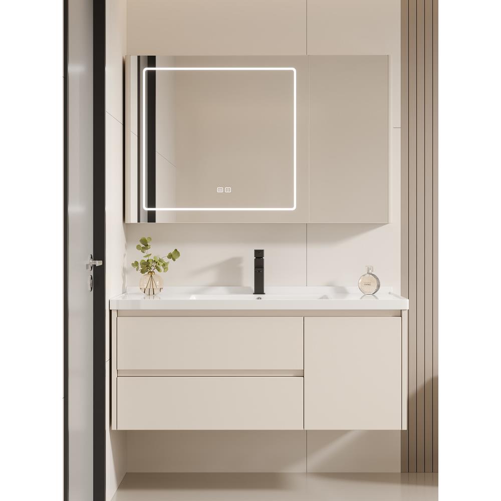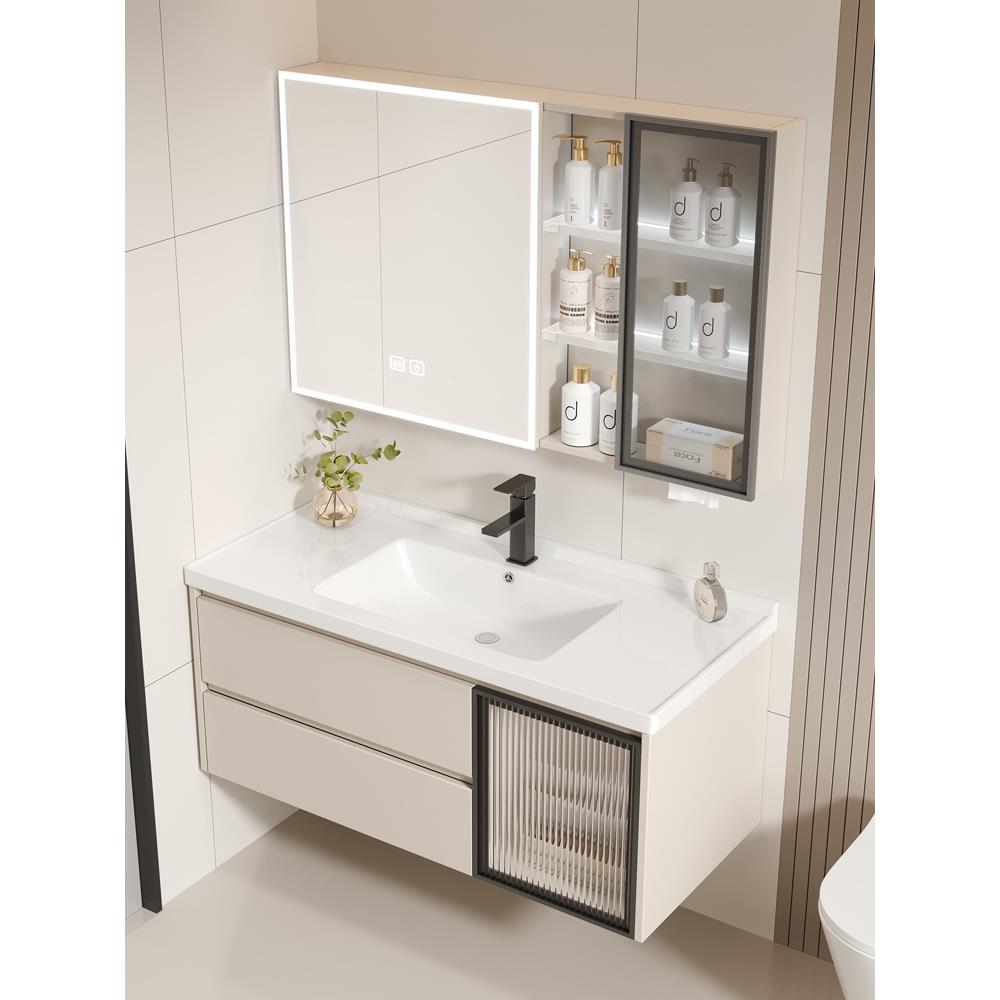 奶油风蜂窝铝合金浴室柜组合岩板一体陶瓷洗漱台洗脸盆柜双抽屉款饰品