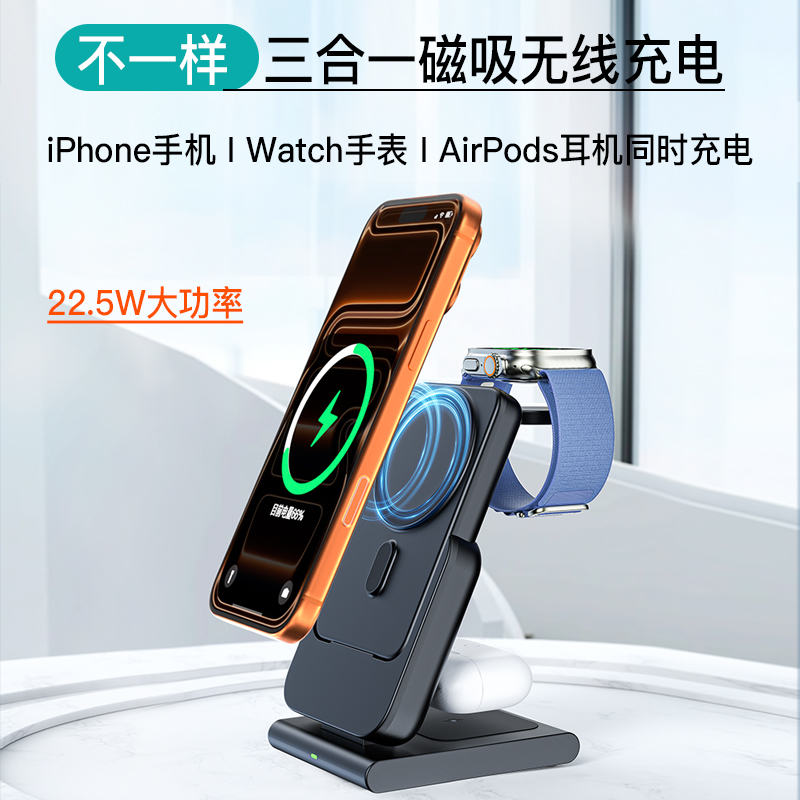 爵位 magsafe磁吸支架适用苹果三合一无线充电器iwatch底座手机手表二合一充电宝可拆卸折叠appleiPhone快充