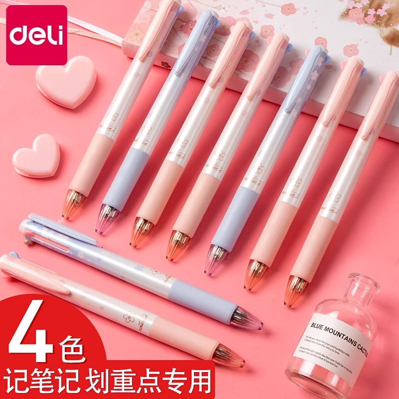 得力四色圆珠笔按压式多色0.7mm圆珠笔学生用可爱樱律花杆少女彩色多色笔合一做笔记用圆柱笔