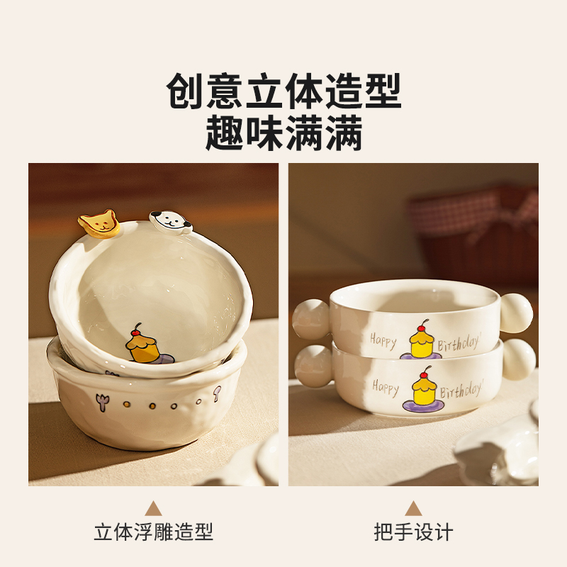 奶油风陶瓷碗家用卡通菜盘子可爱米饭碗汤碗釉下彩儿童餐具耐高温