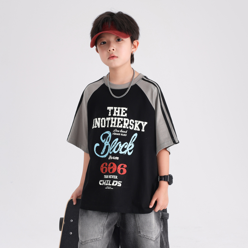 男童夏季美式撞色运动短袖T恤2025新款青少年儿童纯棉半袖薄上衣