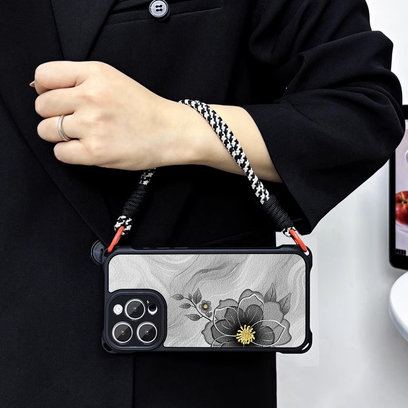 复古山茶花适用苹果16promax手机壳四角防摔iPhone15por保护套小羊皮14por斜跨长短挂绳13pm小众12女款11潮牌