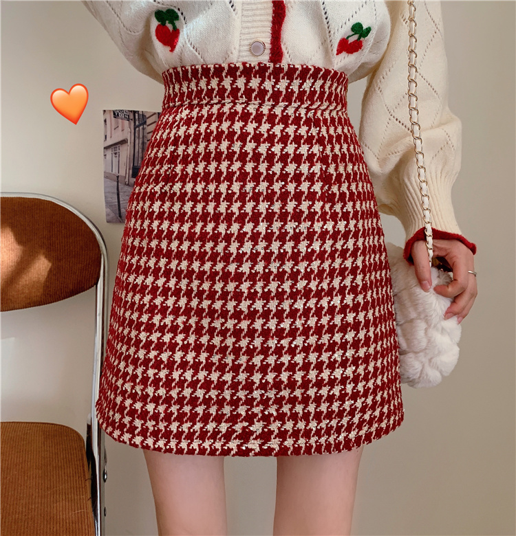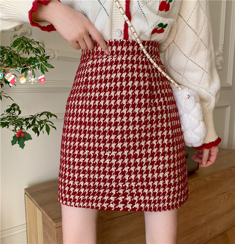 红色短裙女秋冬新款高腰显瘦一步裙包臀A字裙大码毛呢格子半身裙