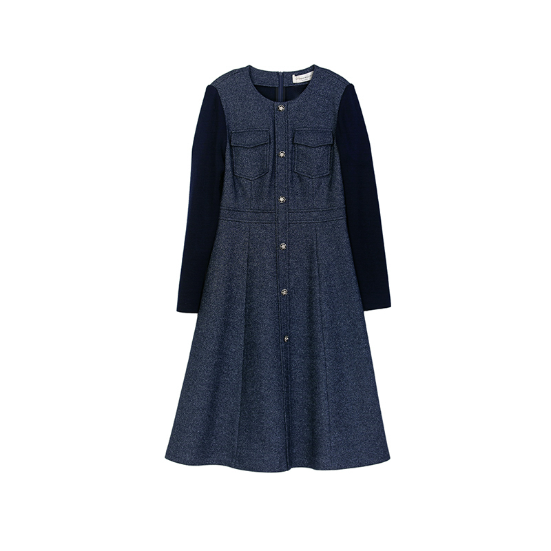 诗梦女装藏青色小香风绵羊毛针织连衣裙收腰显瘦气质圆领华丽高贵