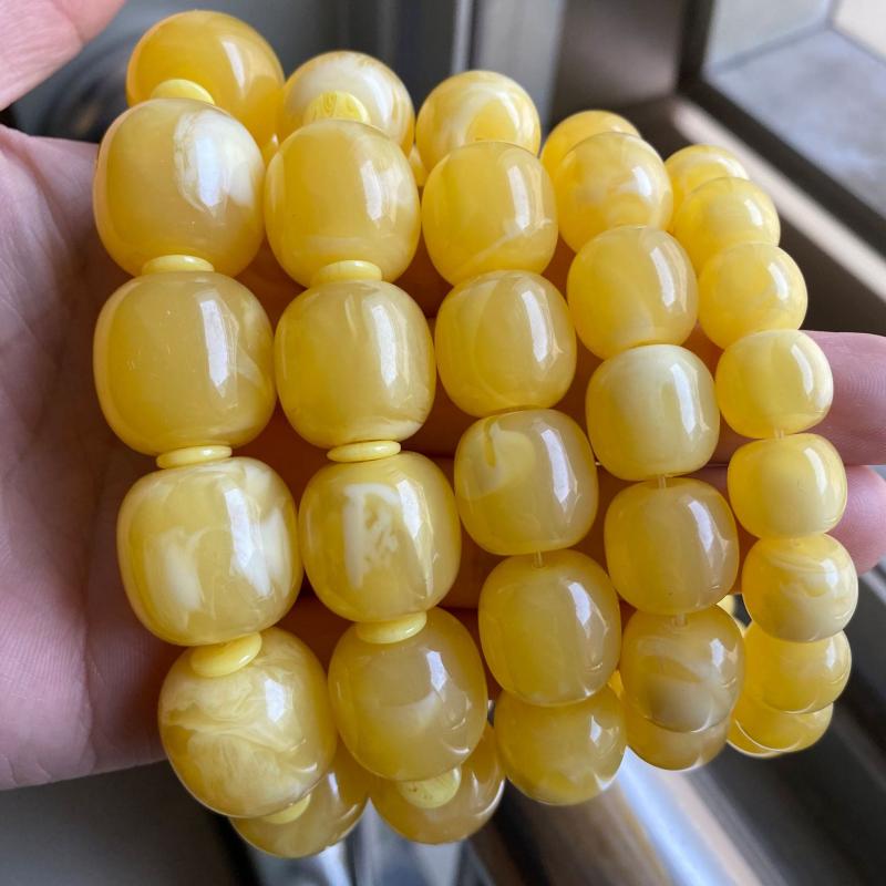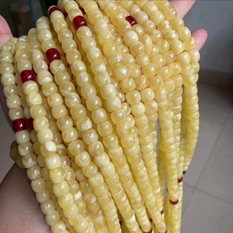 仿蜜蜡鸡油黄白花鼓珠手串配饰金刚菩提星月树脂桶珠飘花单圈佛珠