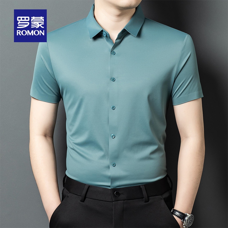 罗蒙无痕冰丝衬衫短袖男士夏季商务休闲弹力抗皱透气薄款上衣衬衣
