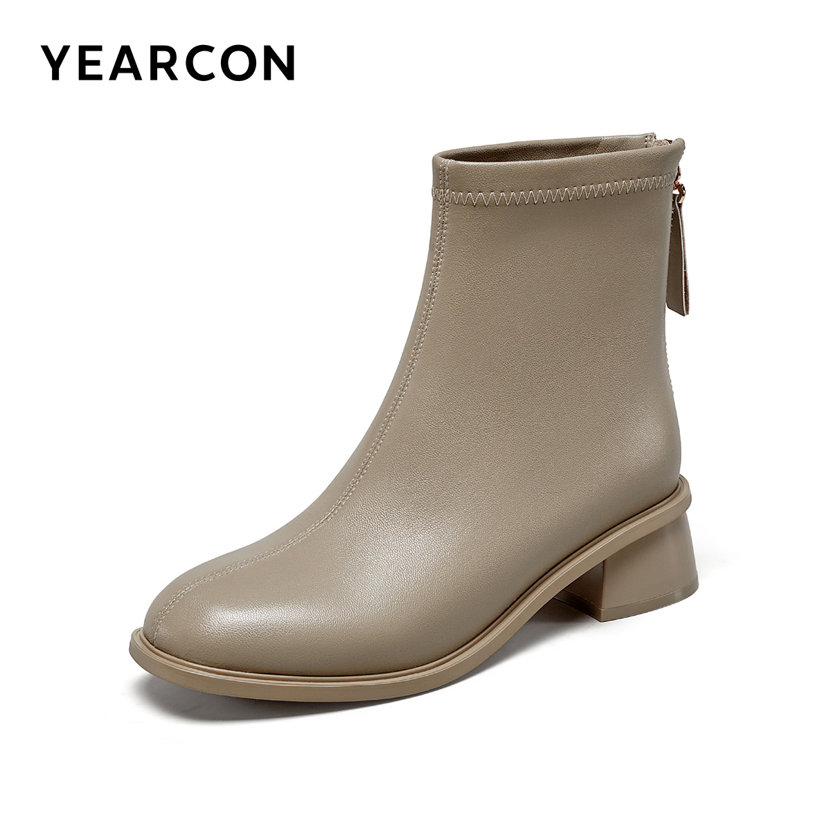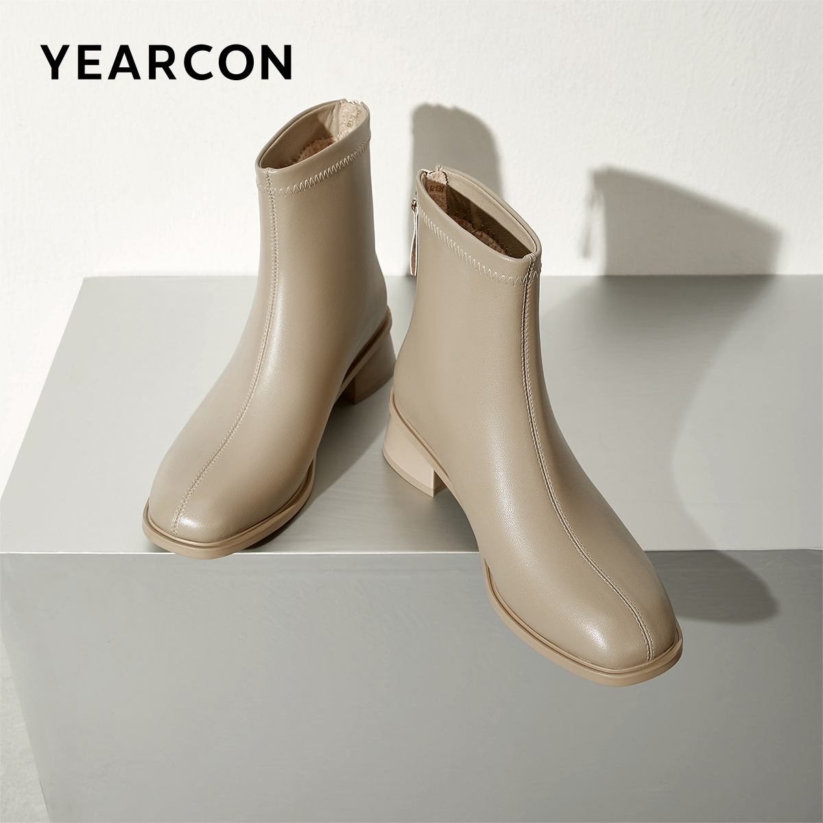 意尔康女鞋秋冬休闲短靴粗跟单靴气质瘦瘦靴复古及踝靴女士皮鞋