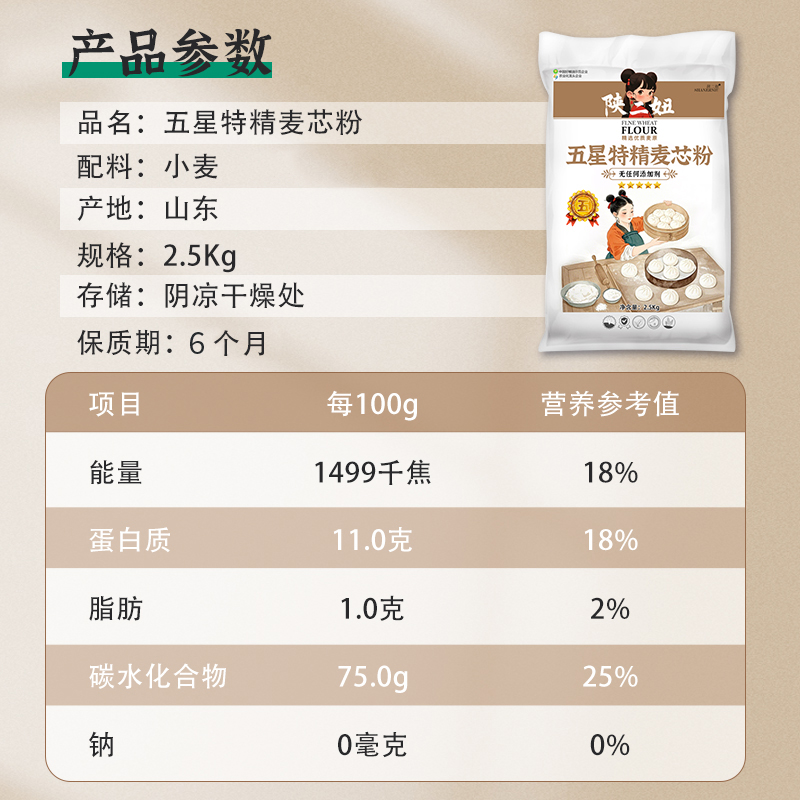2.5kg五星特精麦芯粉5斤无添加新国标家用中筋面粉包子饺子面条