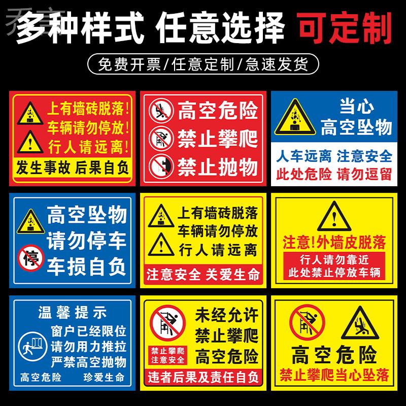 当心墙瓷砖脱落车辆请勿停放在行人请远离高空坠物标识PVC标志铝板反光膜警示牌提示牌定制