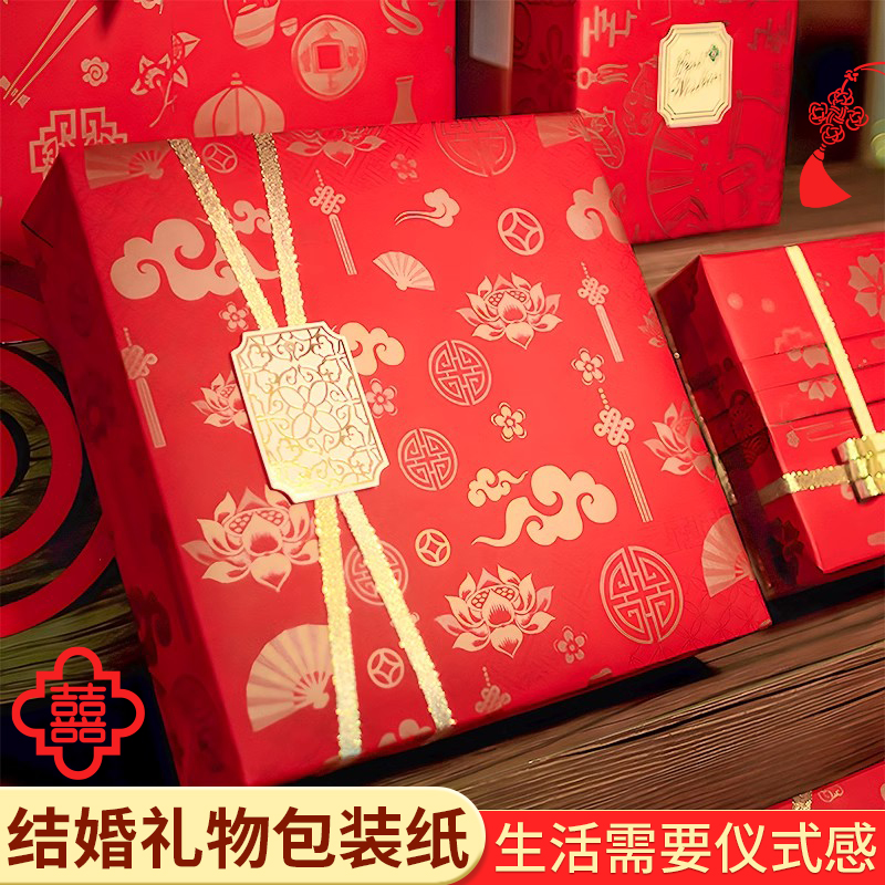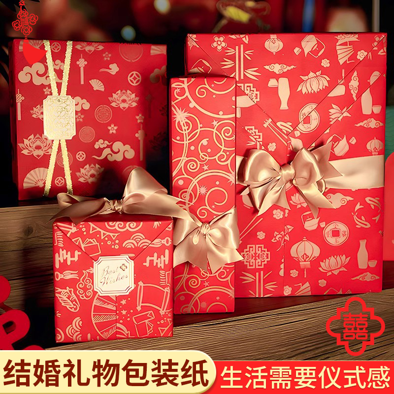 结婚礼物包装纸大尺寸年会礼盒装饰纸礼品纸包鞋盒纸中国风红色礼品纸情人节礼物纸节日喜庆传统礼盒礼物装饰