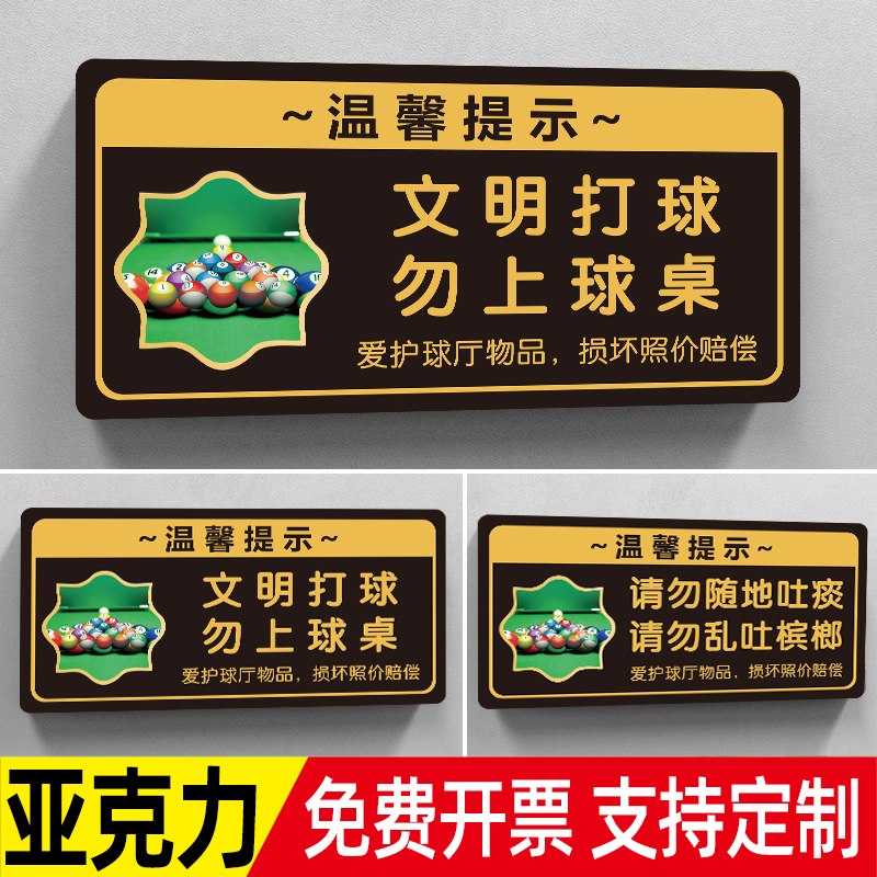 台球厅台球室温馨提示牌请不要坐在球台上请勿乱扔烟头扎杆要小心标志牌标桌球室告示牌语亚克力墙贴定制