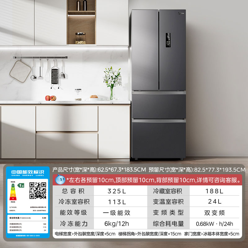 【换新补贴】美的325升法式多门四门双开门无霜变频一级小型冰箱