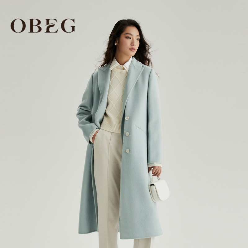 OBEG欧碧倩冬装蓝色双面呢羊毛大衣韩版宽松直筒外套50464544