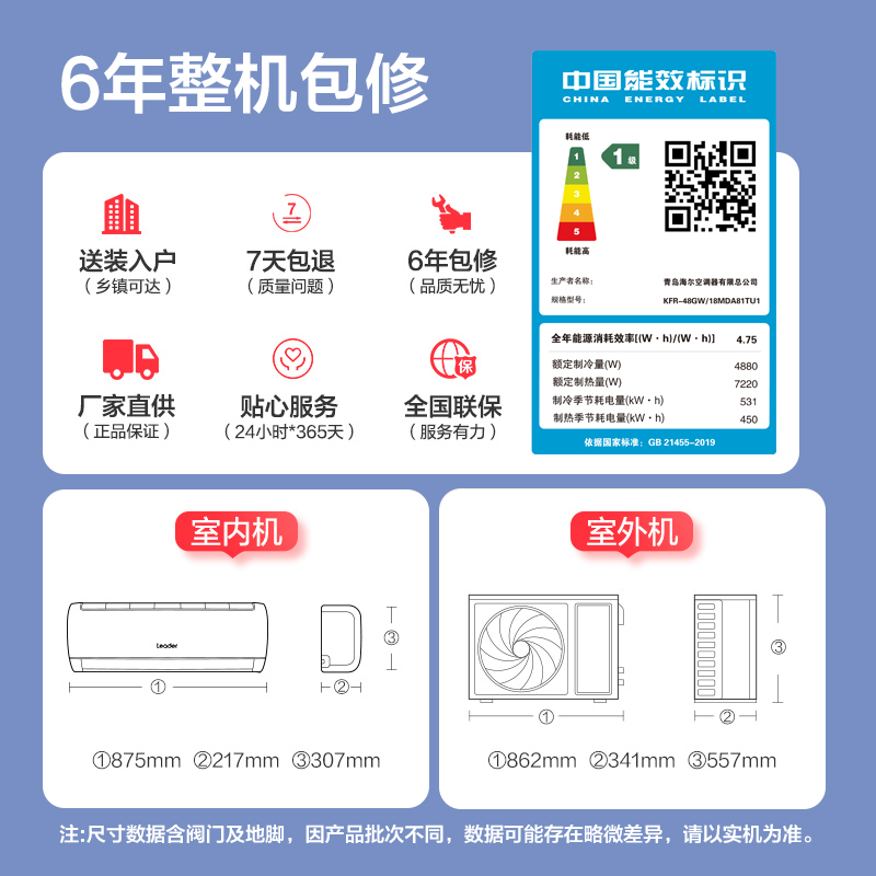 海尔智家出品统帅空调1匹1.5匹家用一级变频省电卧室挂机旗舰店