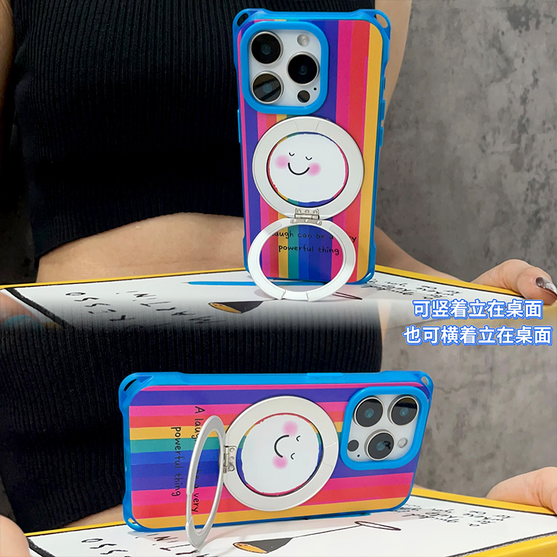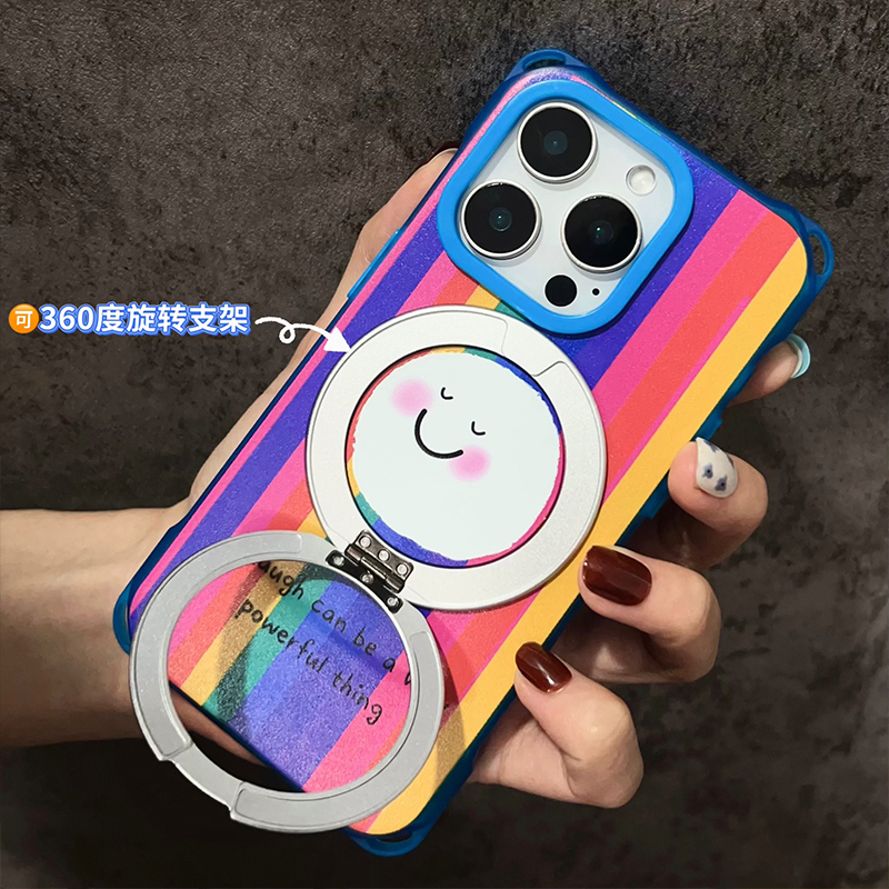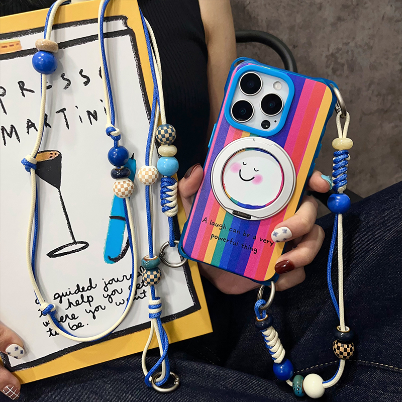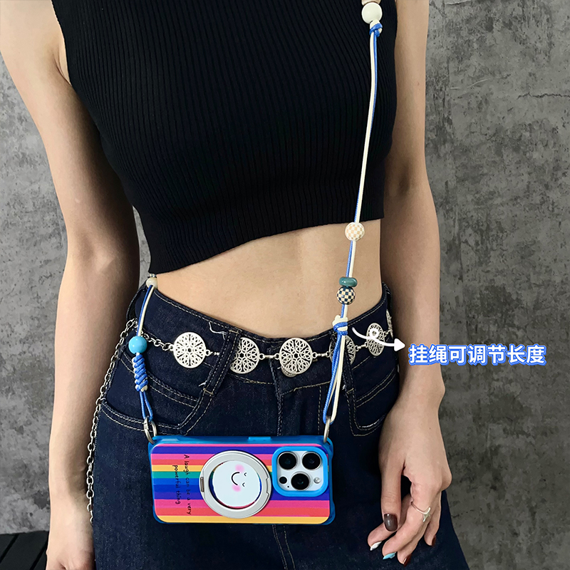 笑会发光~原创360度旋转支点壳适用于苹果16pro手机壳彩条纹vivox200调节挂绳斜挎小米15链条pura80背带斜跨