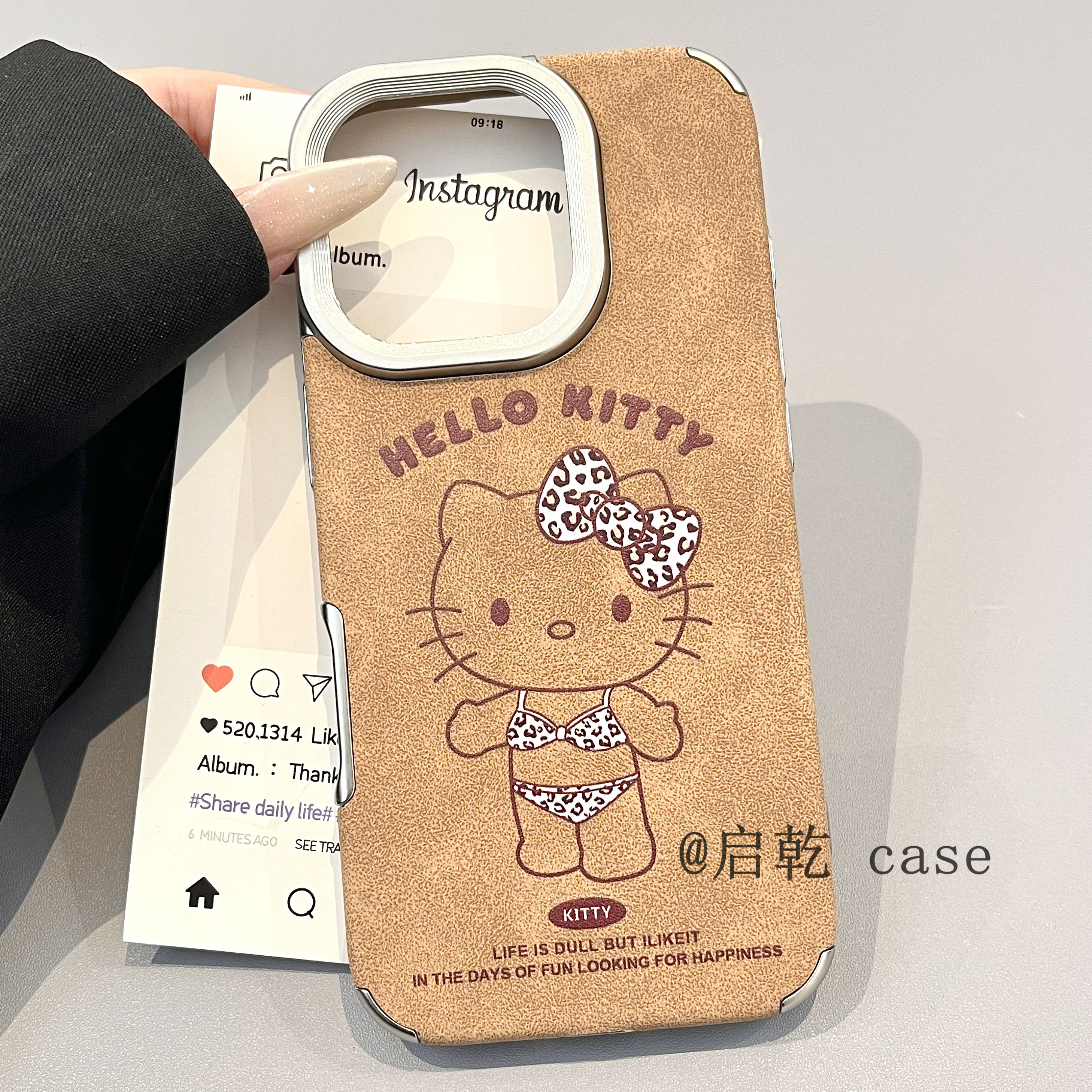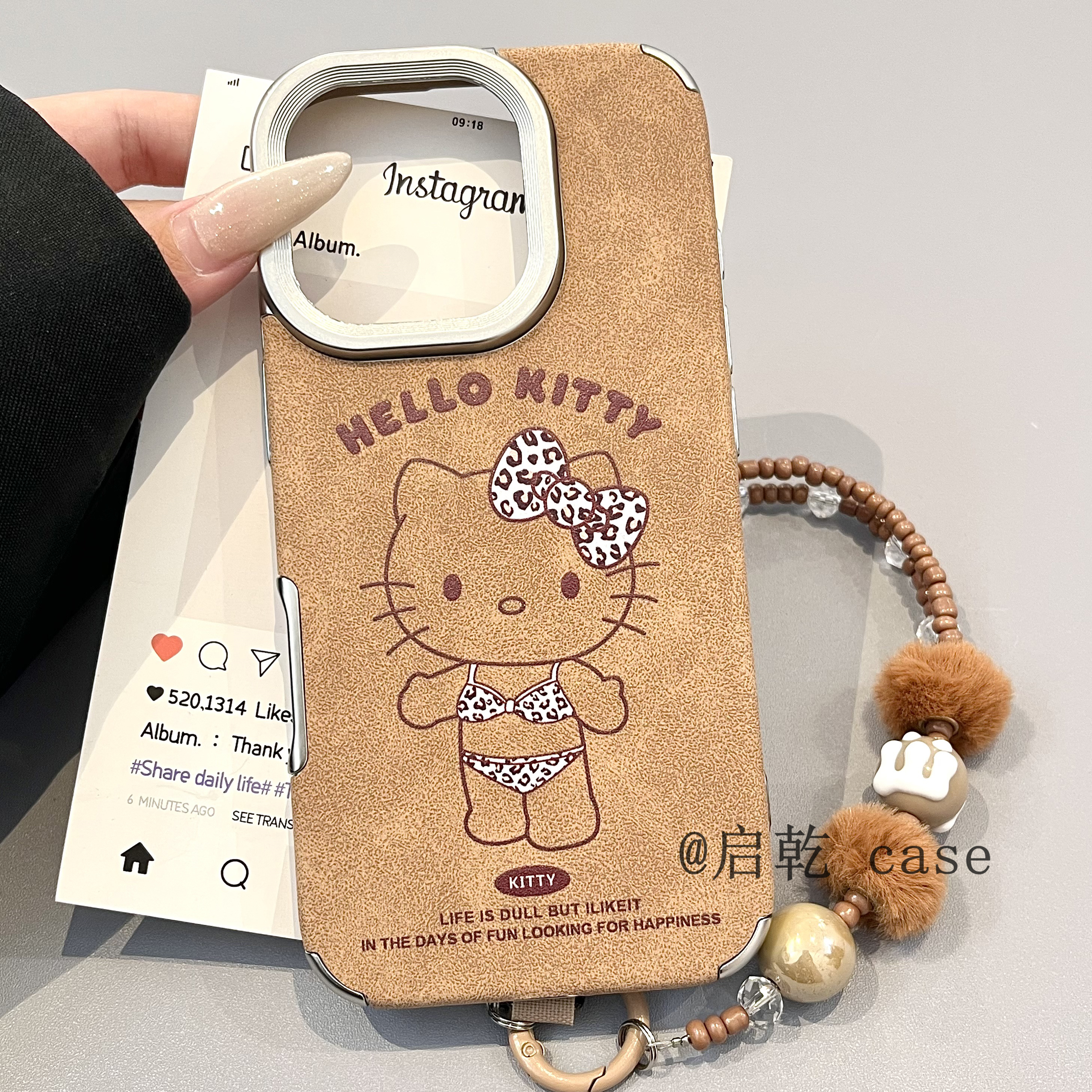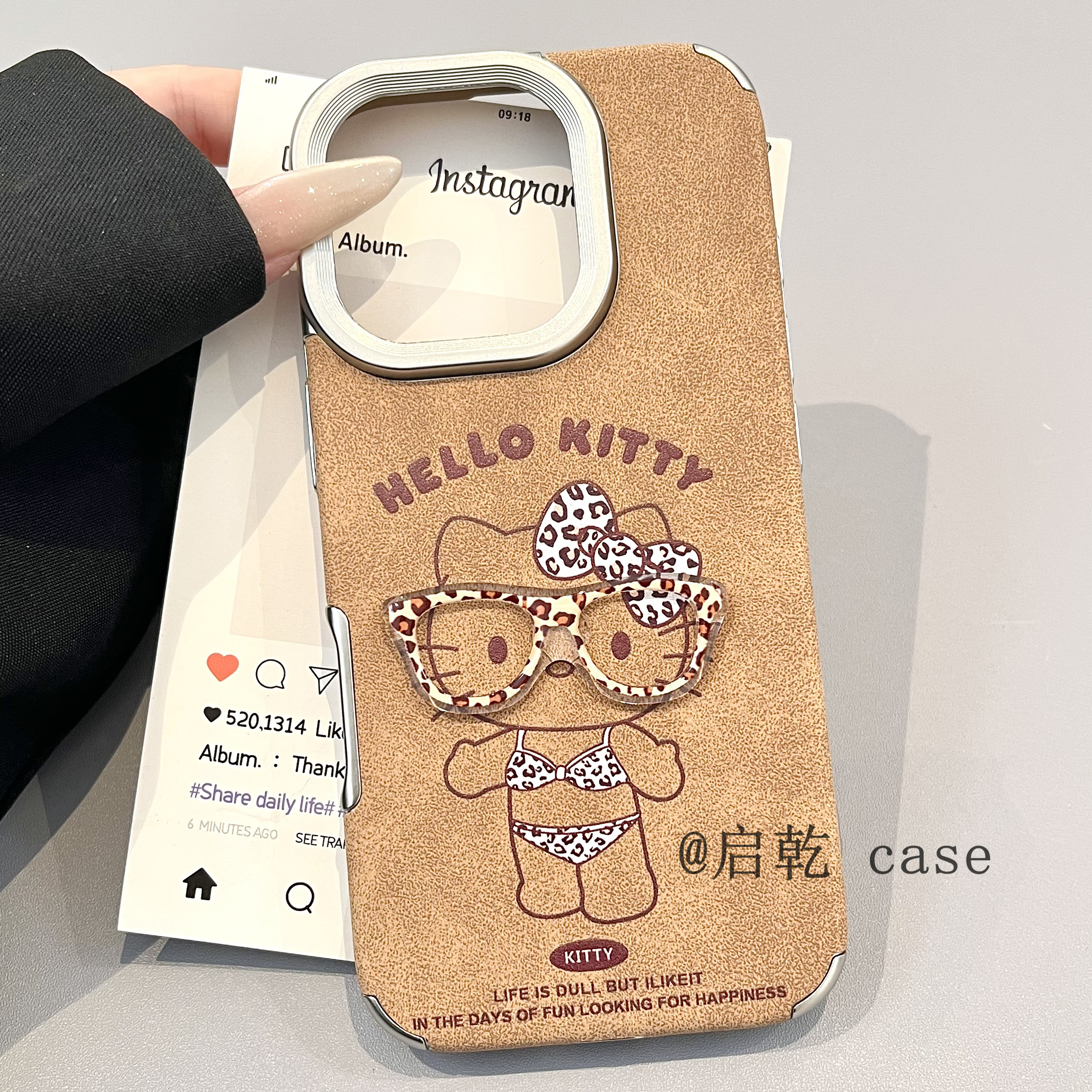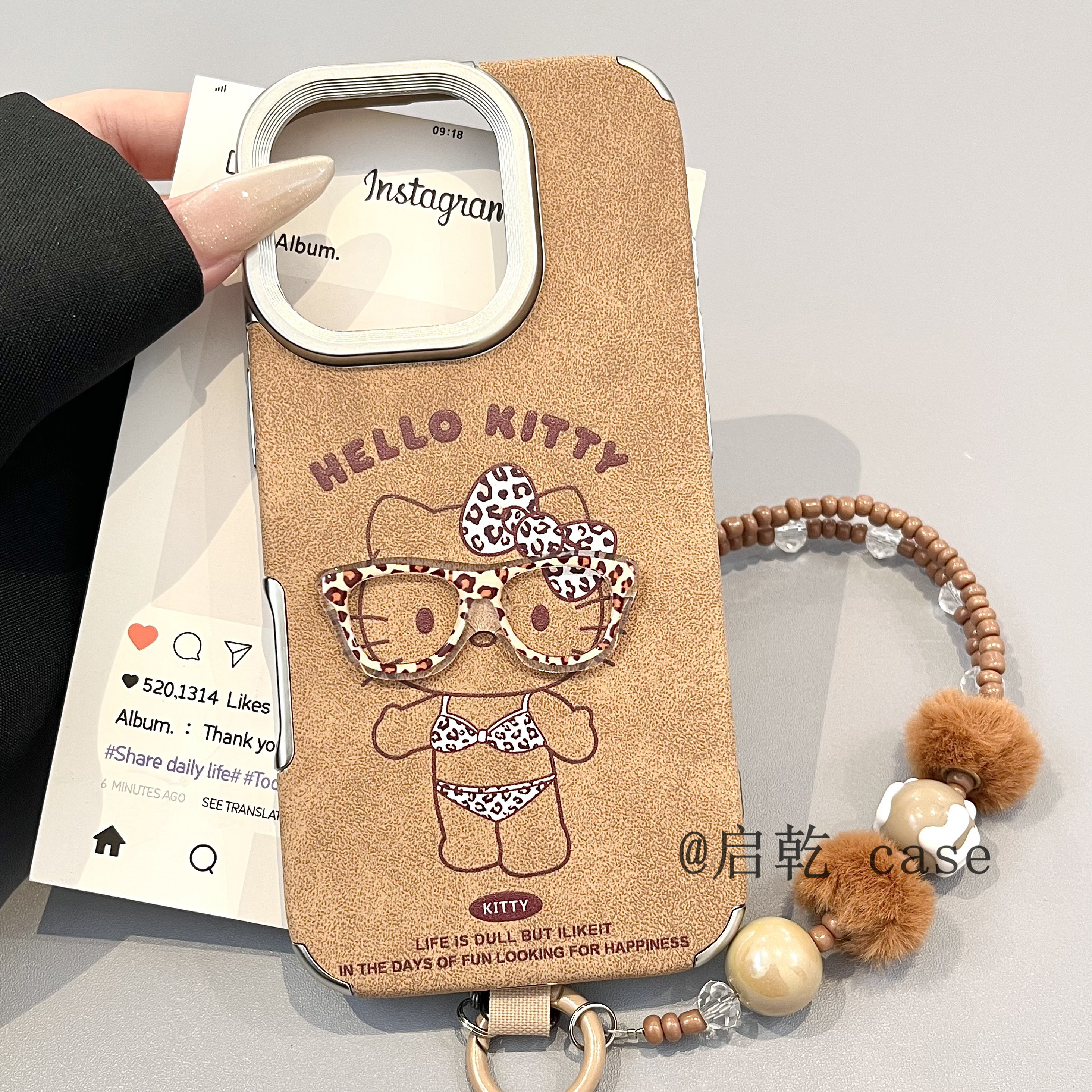 启乾 棕色豹纹眼镜凯蒂猫iPhone17手机壳16适用苹果14/13promax皮质软壳12链条挂绳15美拉德HelloKitty新款女