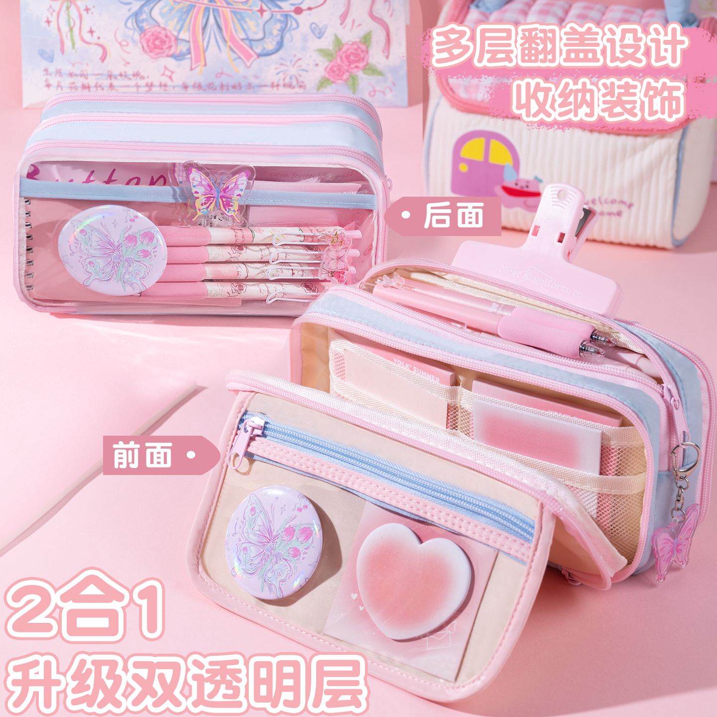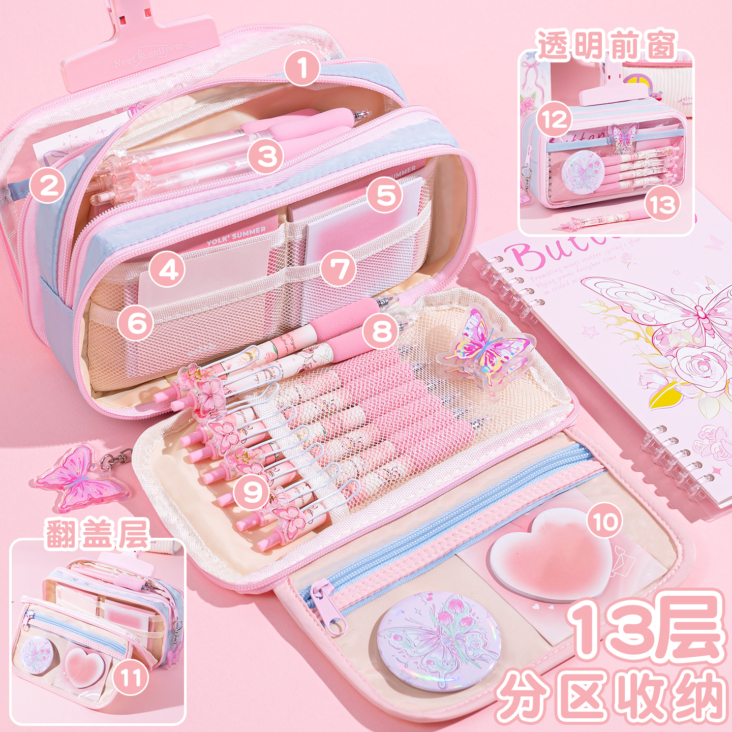 升级13层!撞色蝴蝶笔袋高颜值大容量女生2025新款文具盒女孩款小学生透明铅笔盒ins初中男生超火文具袋男孩