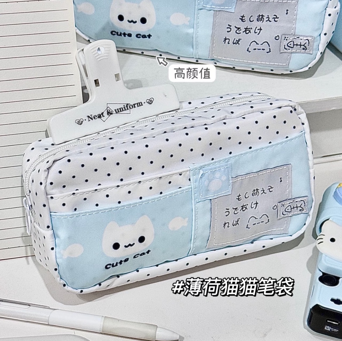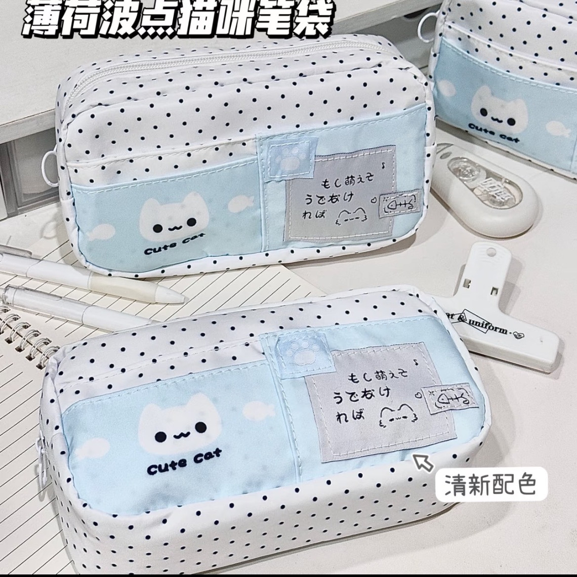 ins新款薄荷蓝波点猫笔袋大容量铅笔盒多层高颜值小众痛包文具袋