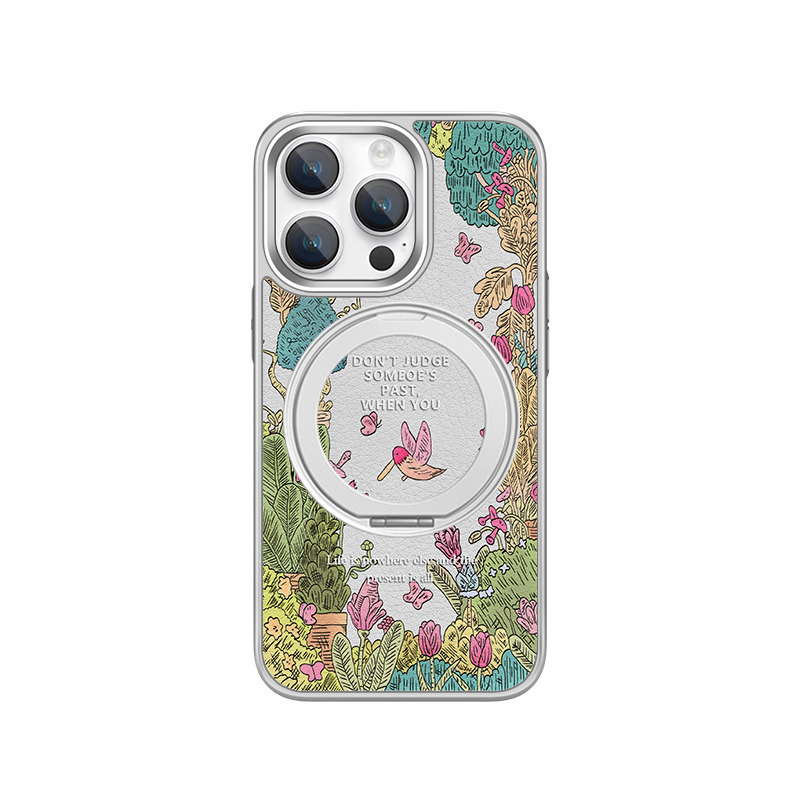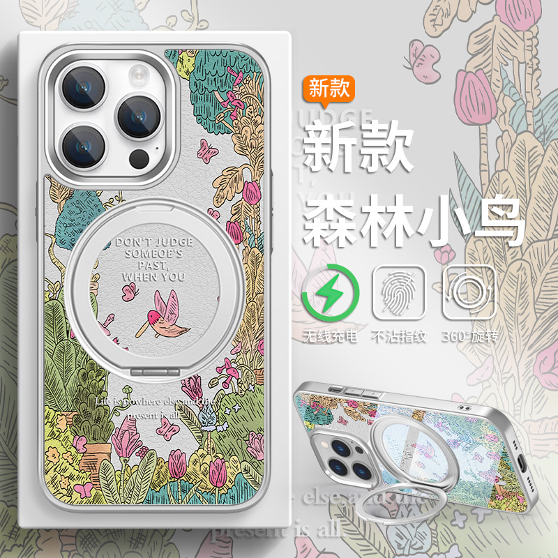 适用iPhone16promax春天手机壳磁吸带支架15plus支点壳苹果14绿色森系13pro小鸟12promax保护套11magsafe指环