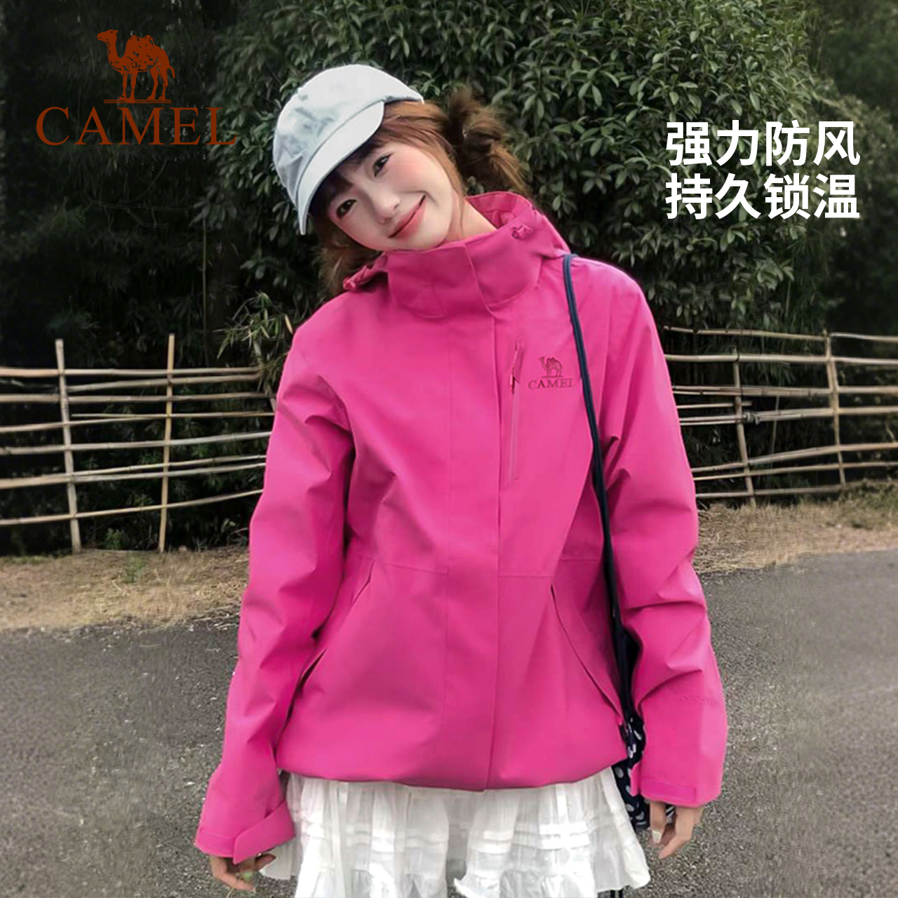 骆驼户外紫玫红冲锋衣女暴雨防水防风外套男三合一两件套登山服装