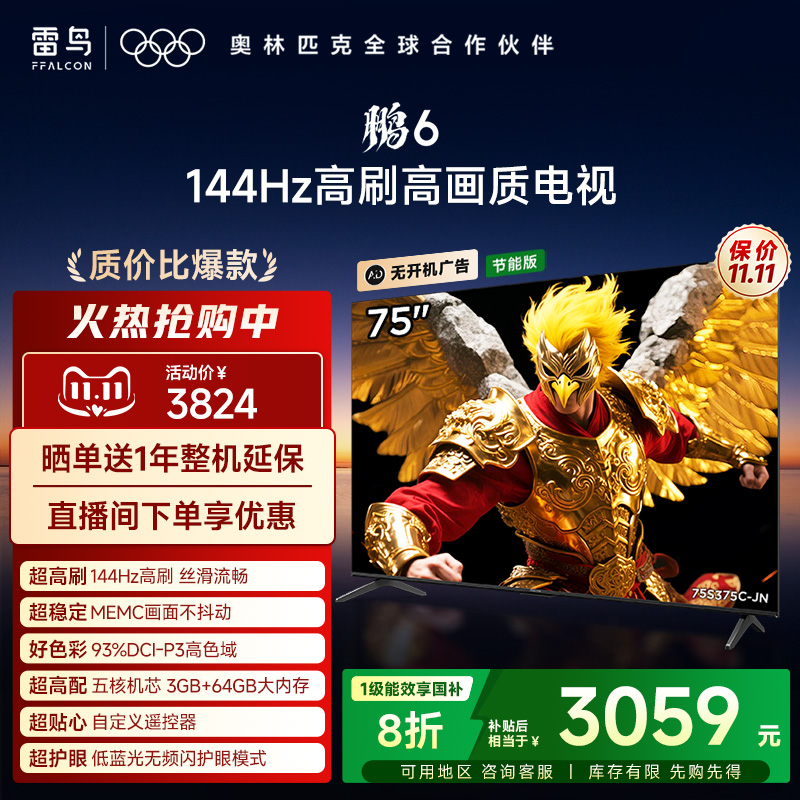TCL雷鸟鹏6 75英寸144Hz高刷MEMC高色域3+64G电视机以旧换新补贴