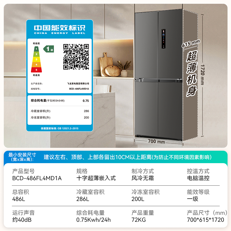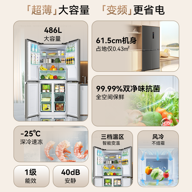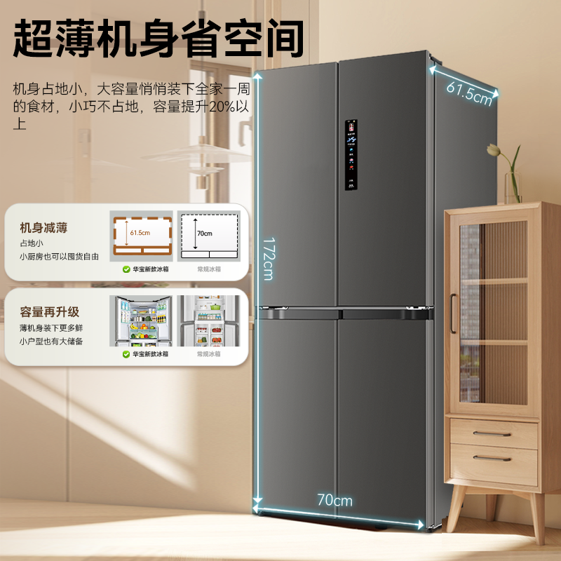 华宝486L大容量十字四门双开对开一级变频风冷家用宿舍出租房冰箱