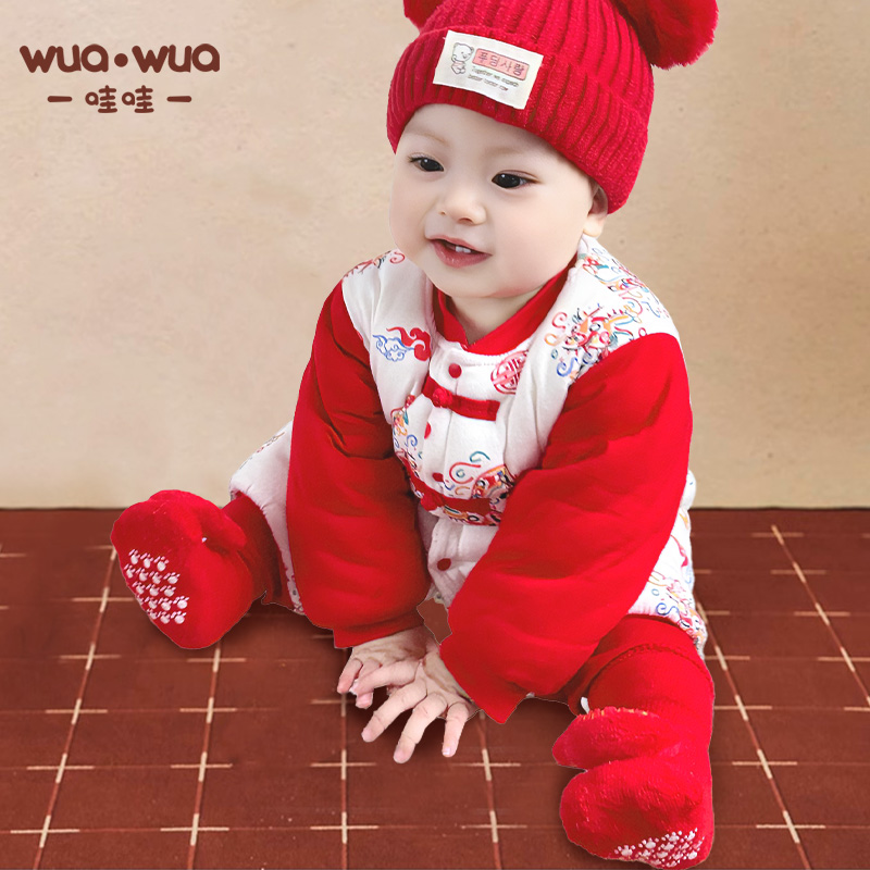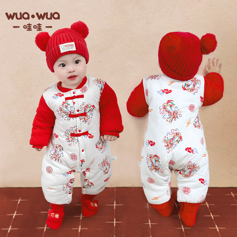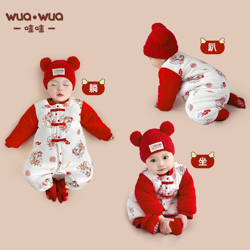 哇哇婴儿衣服冬季棉服新年拜年喜庆宝宝满月周岁百天连体衣初生