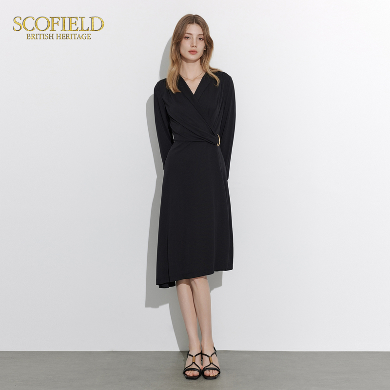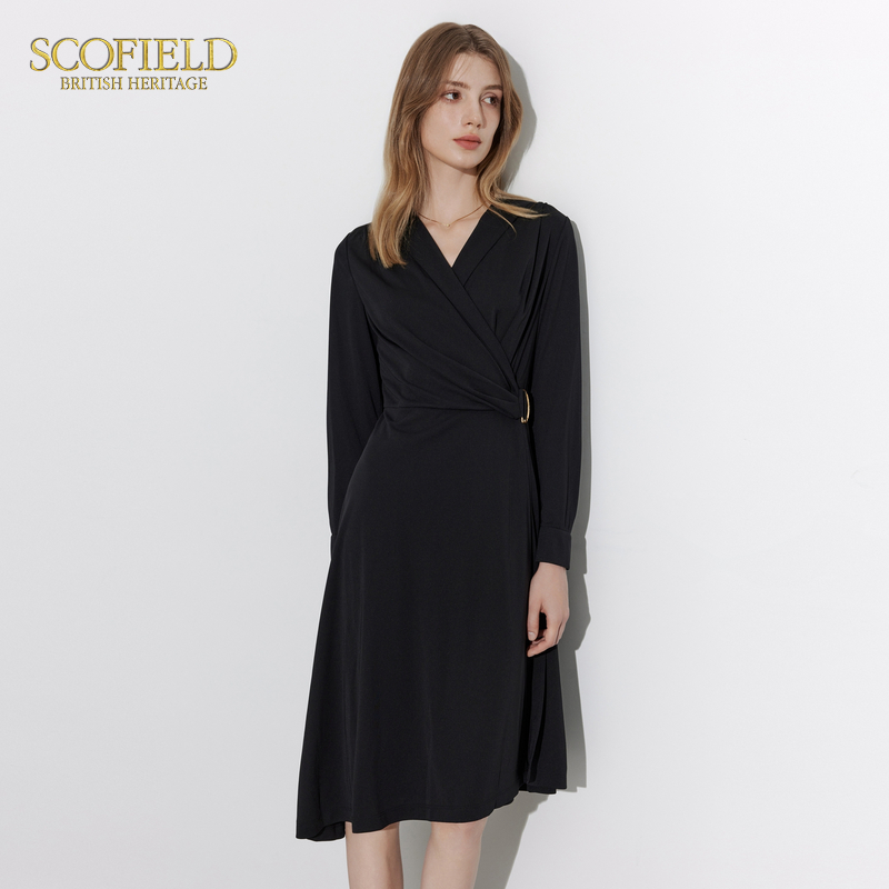 Scofield女装V领修饰A字裙摆优雅法式腰部褶皱设计气质连衣裙