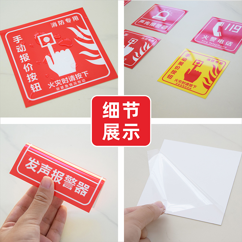 消防标识标牌消火栓消防器材手动火灾报警按钮标志警铃声光报警器火灾时请按下广播标语安全出口上墙贴纸定制