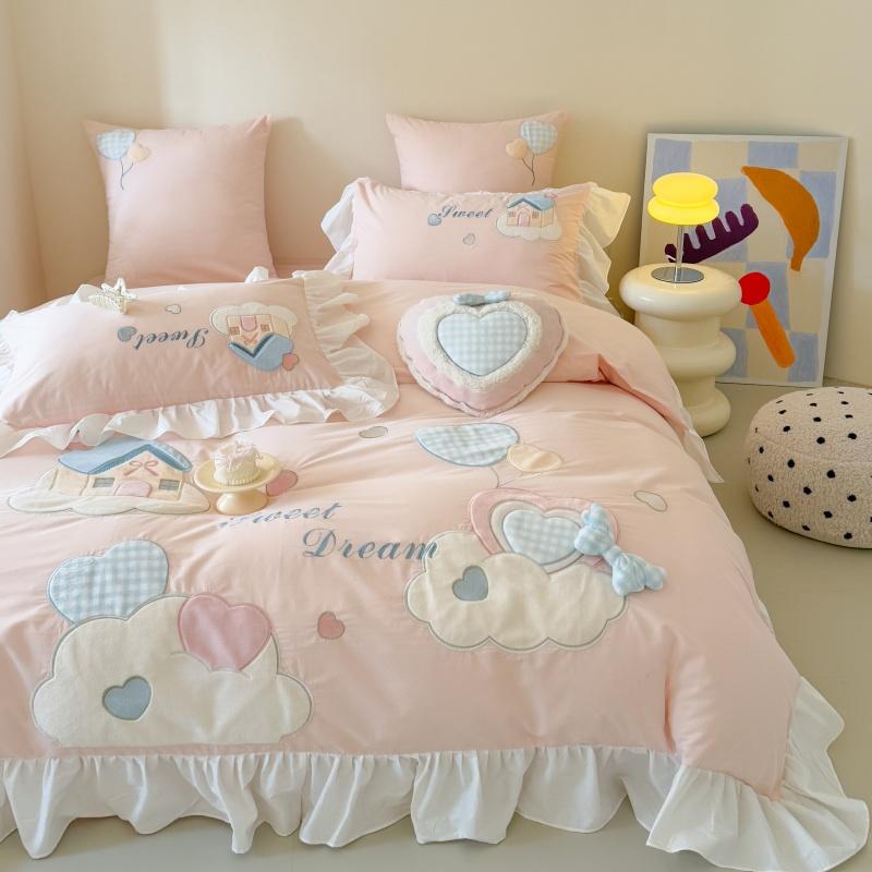 可爱女孩少女心水洗棉四件套纯棉全棉公主风花边刺绣被套床单床品