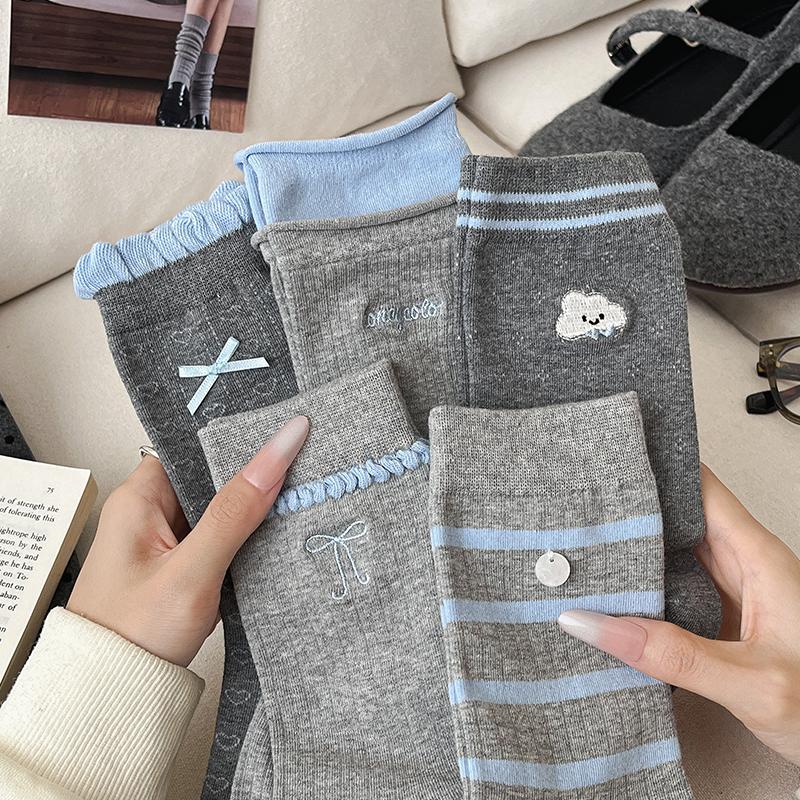 灰色蝴蝶结条纹袜子女中筒棉袜2025新款爆款松口月子长袜冬款爱心