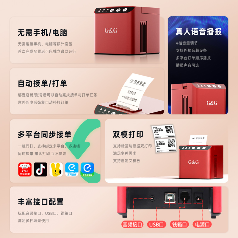 格之格GS220Z外卖打印机 全自动接单真人语音播报 4G款 美团饿了么热敏小票标签机多店铺同时接单