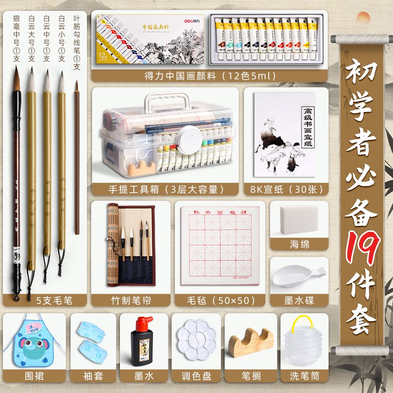 得力国画颜料初学者套装小学生中国画用品工具全套12色24色儿童入门专用水墨画工笔画毛笔宣纸美术材料收纳箱