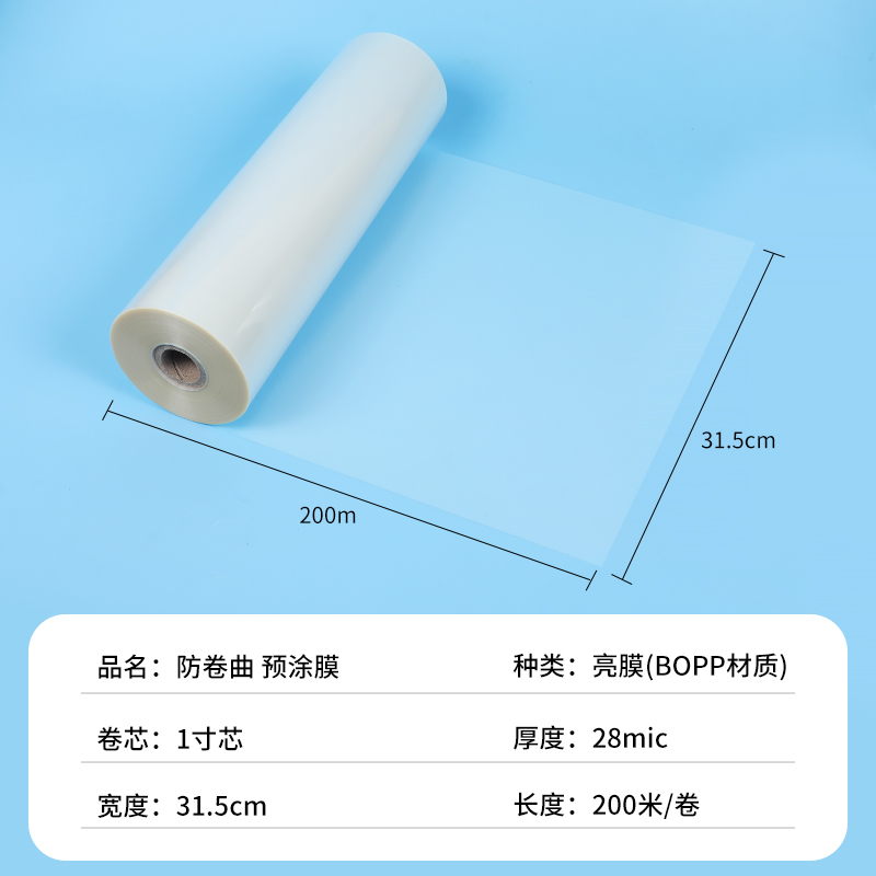 宝预BOPP预涂膜28丝防卷曲亮膜覆膜机亮光膜海报相册塑封膜照片热覆膜过胶膜封塑膜腹膜机热塑膜1寸芯31.5cm