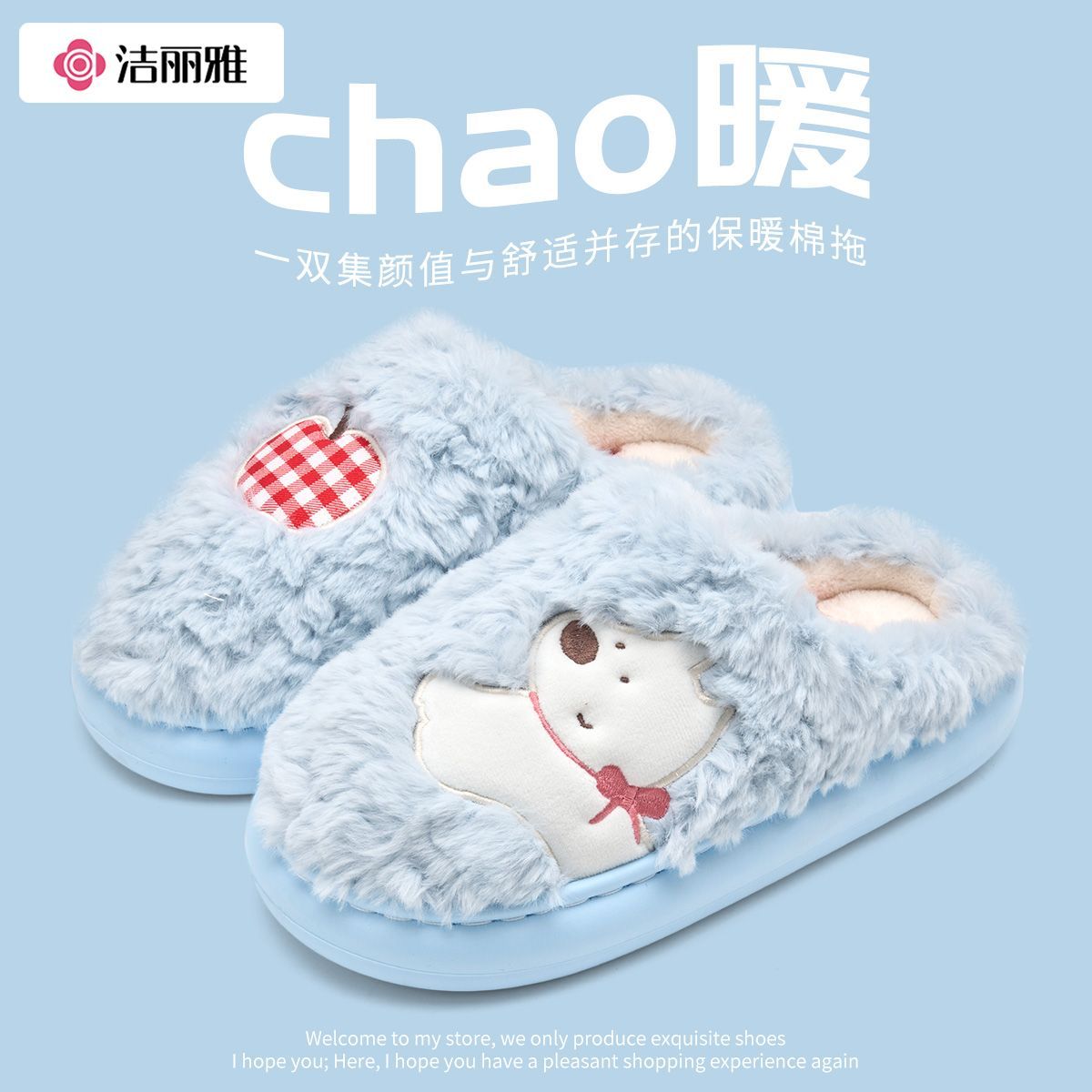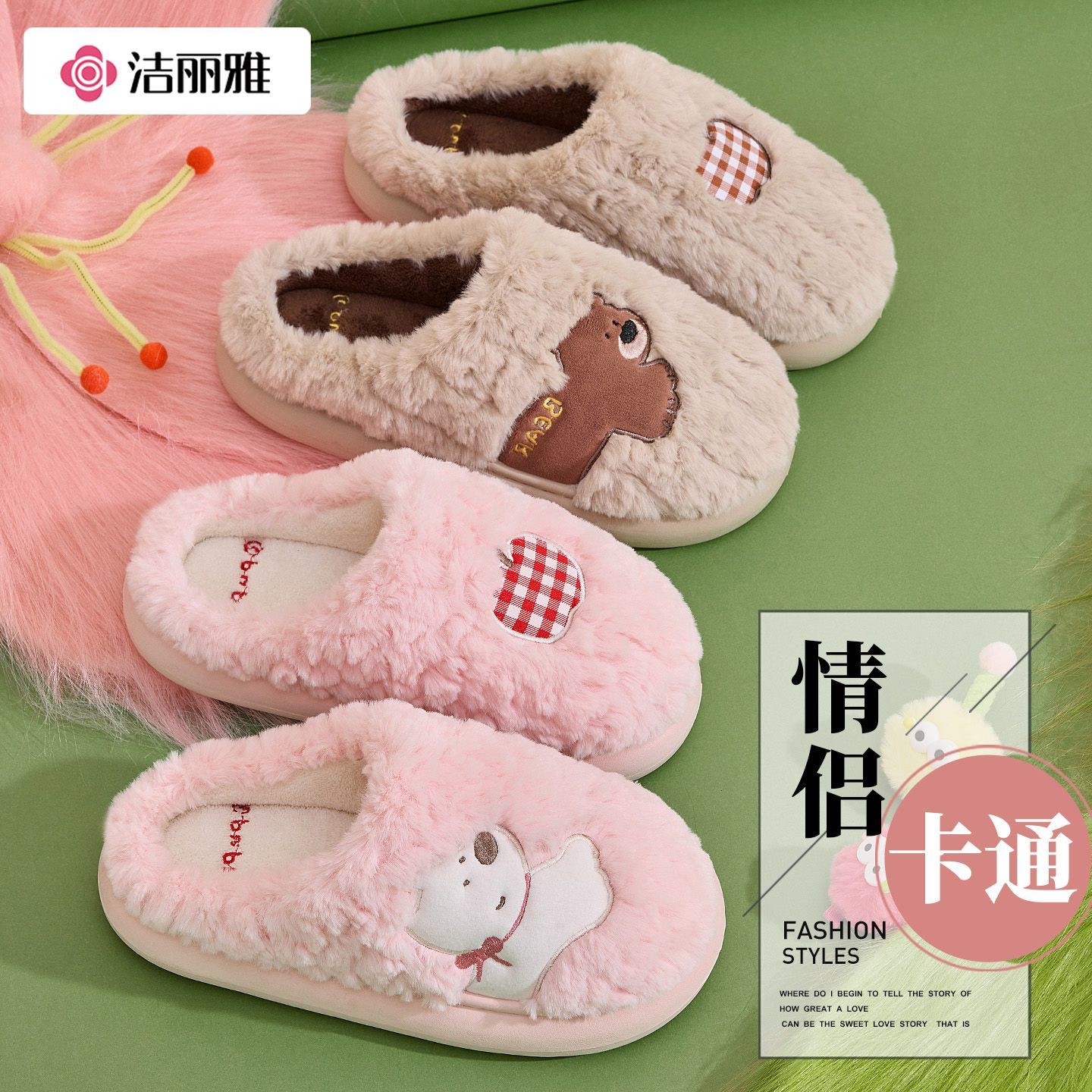 洁丽雅棉拖鞋女冬天可爱厚底卡通室内居家外穿毛毛拖鞋男冬季毛绒