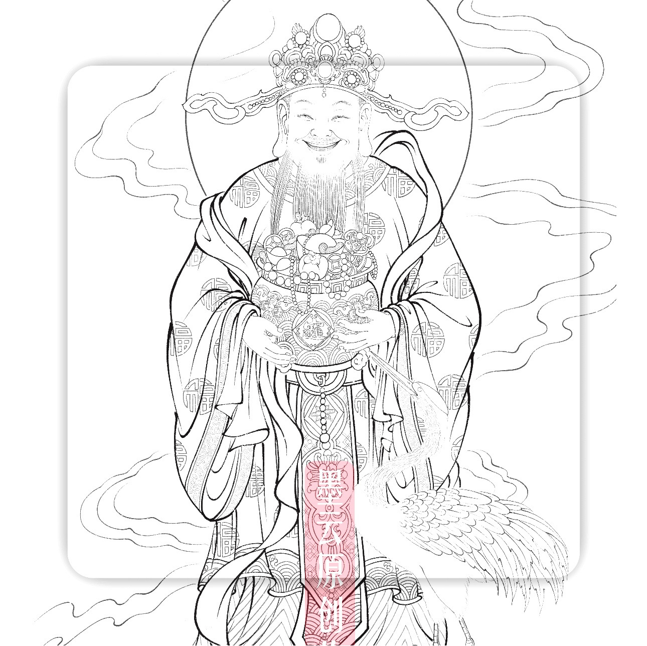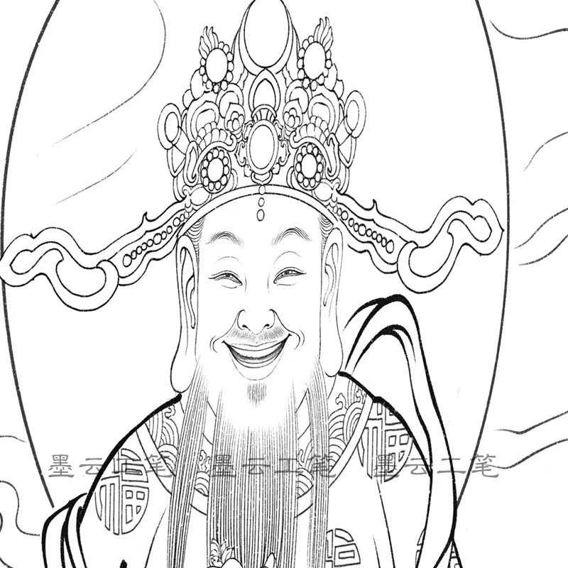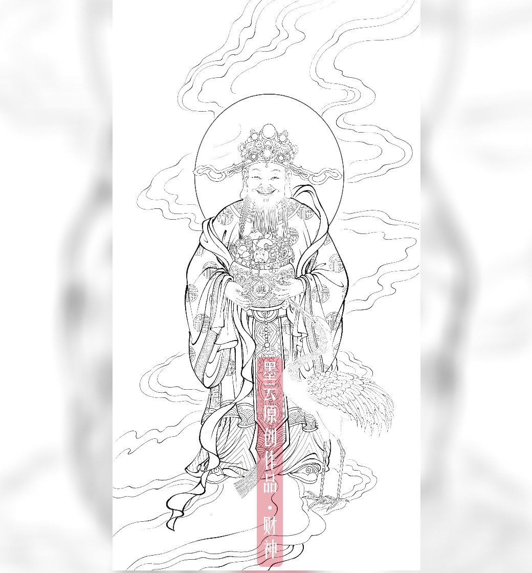 底稿•教程墨云原创作品《财神》工笔画作品底稿线描稿带文字步骤